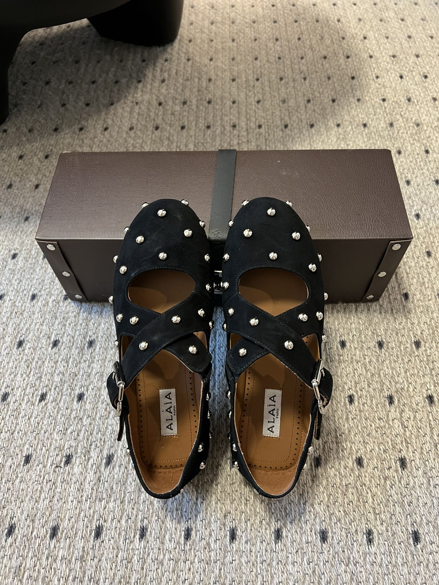 Alaia 25 Criss Cross With Stud Ballet Flats Black Suede Sheepskin 303693