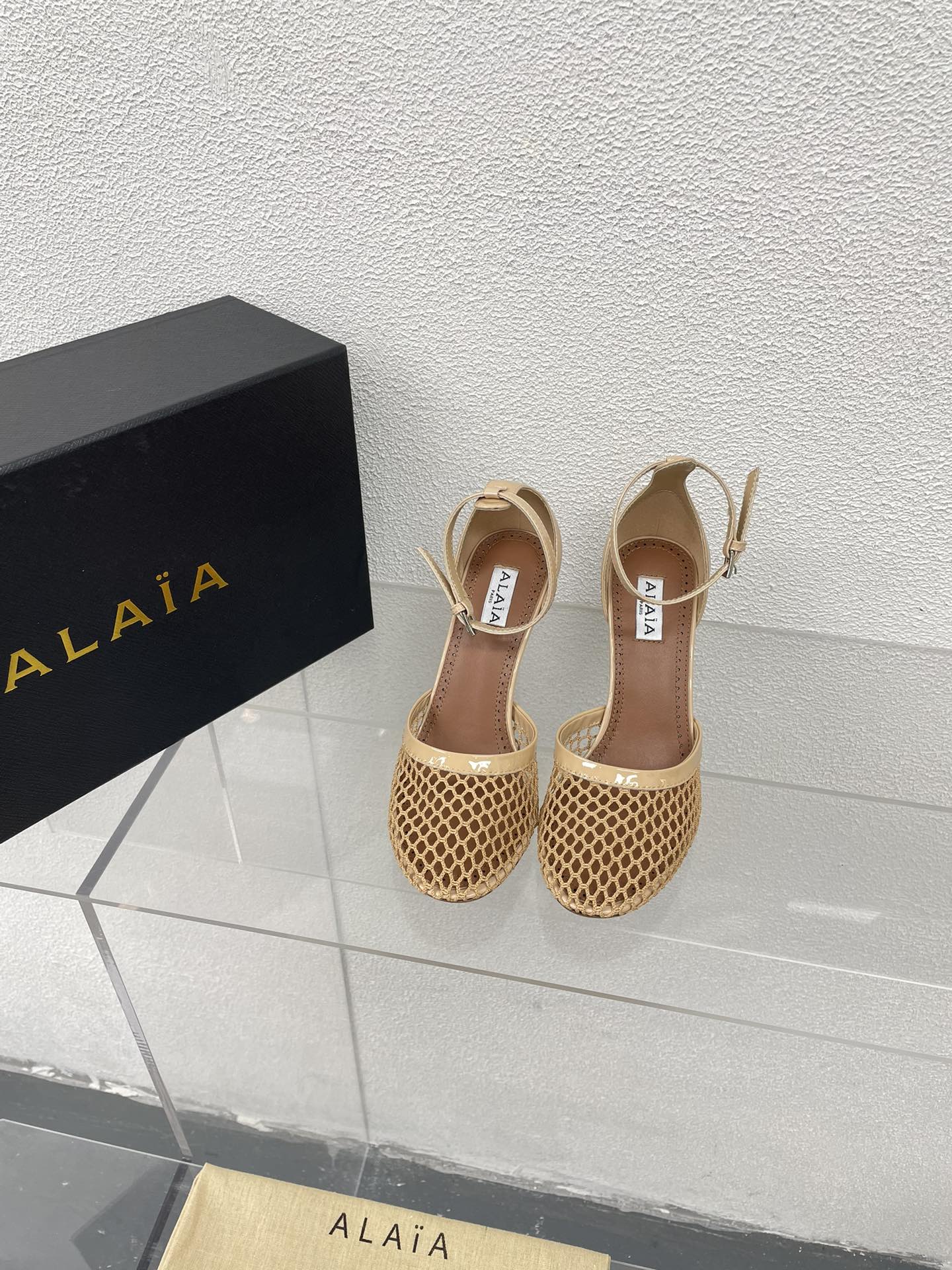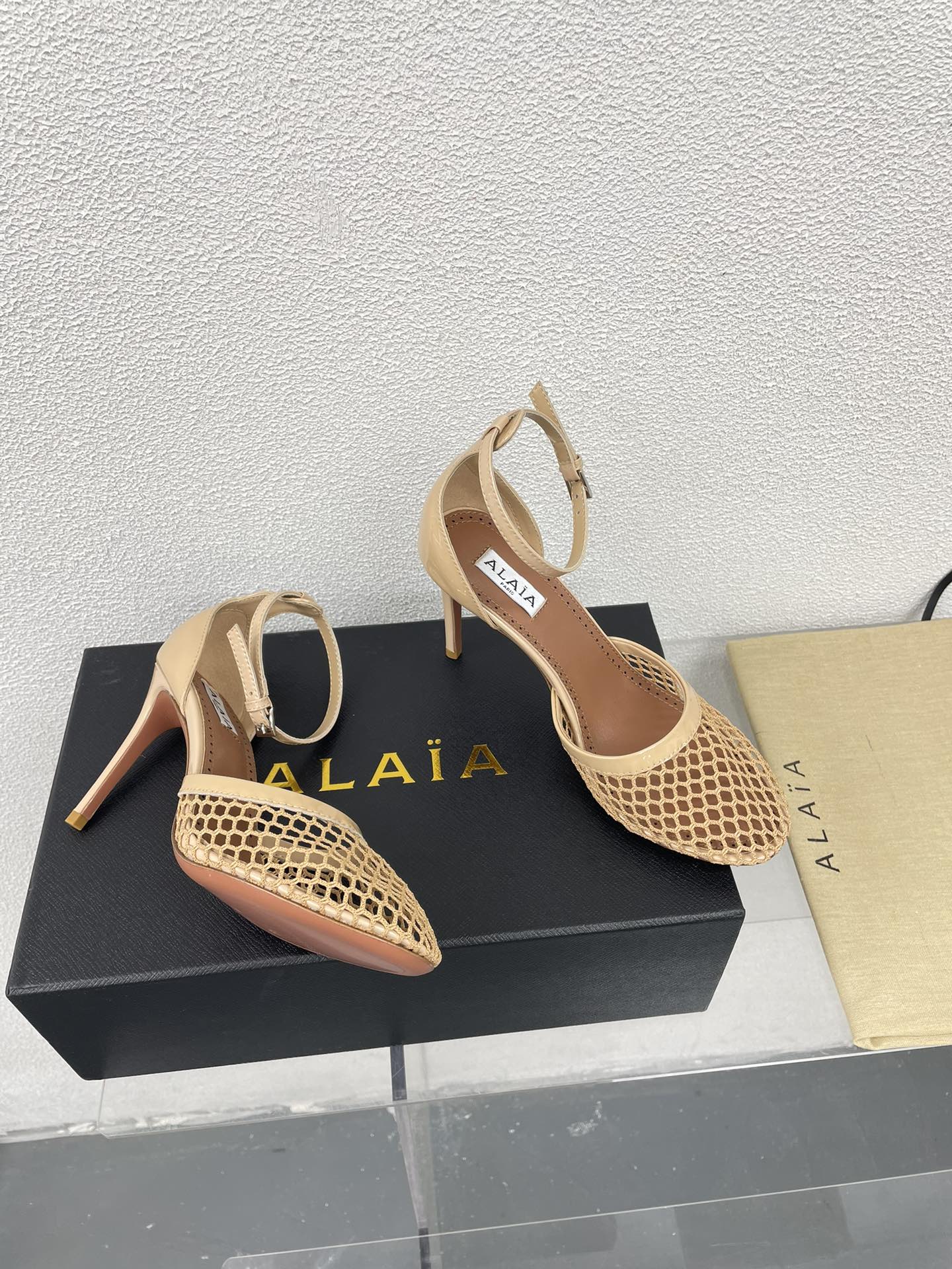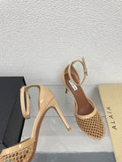ALAIA HIGH FISHNET 9 CM PUMPS IN EGG NOG MESH
