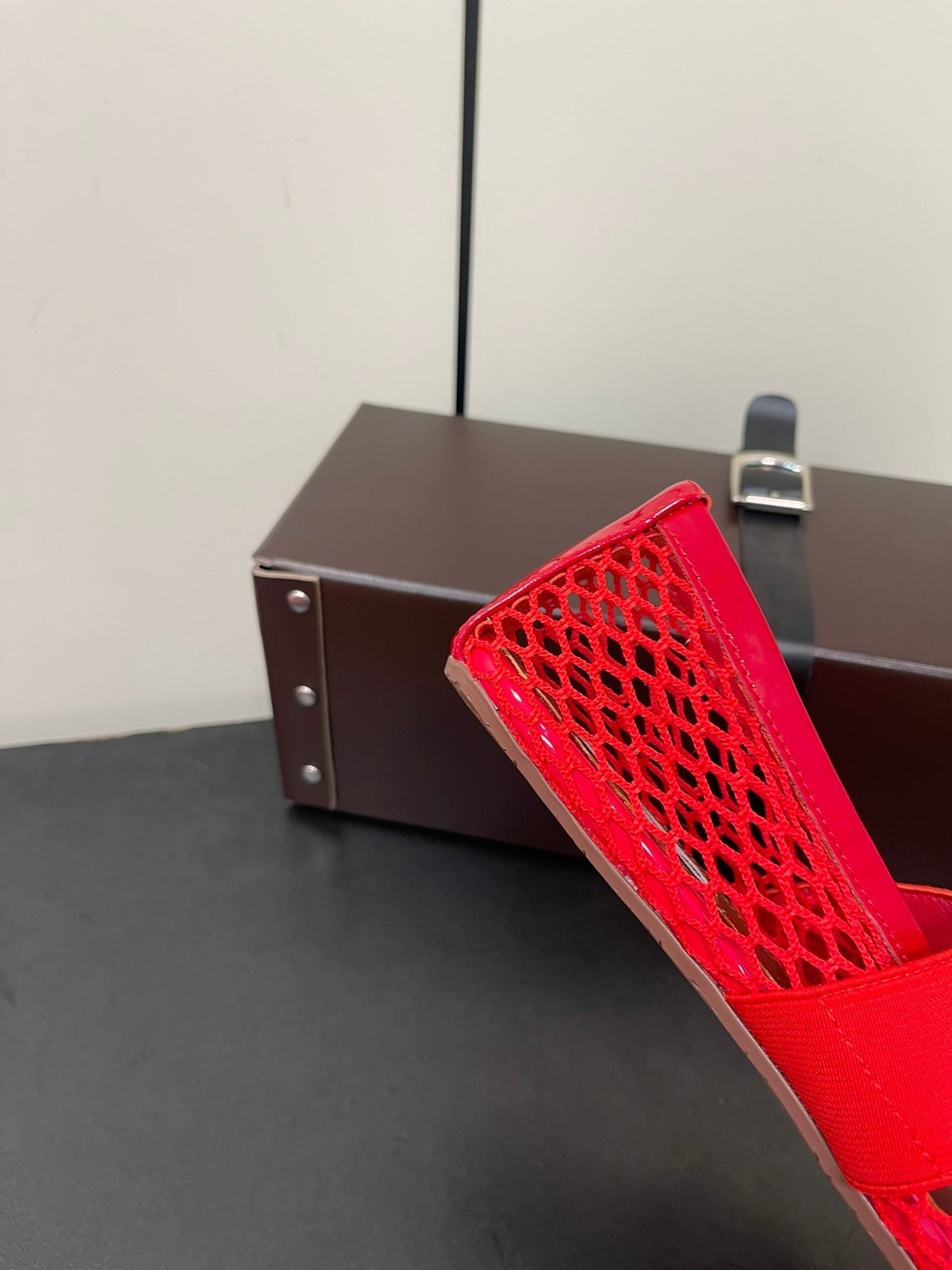ALAIA BALLET FLATS IN CHERRY RED MESH FISHNET WITH GOLD HARDWARE