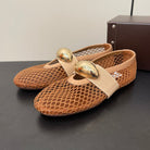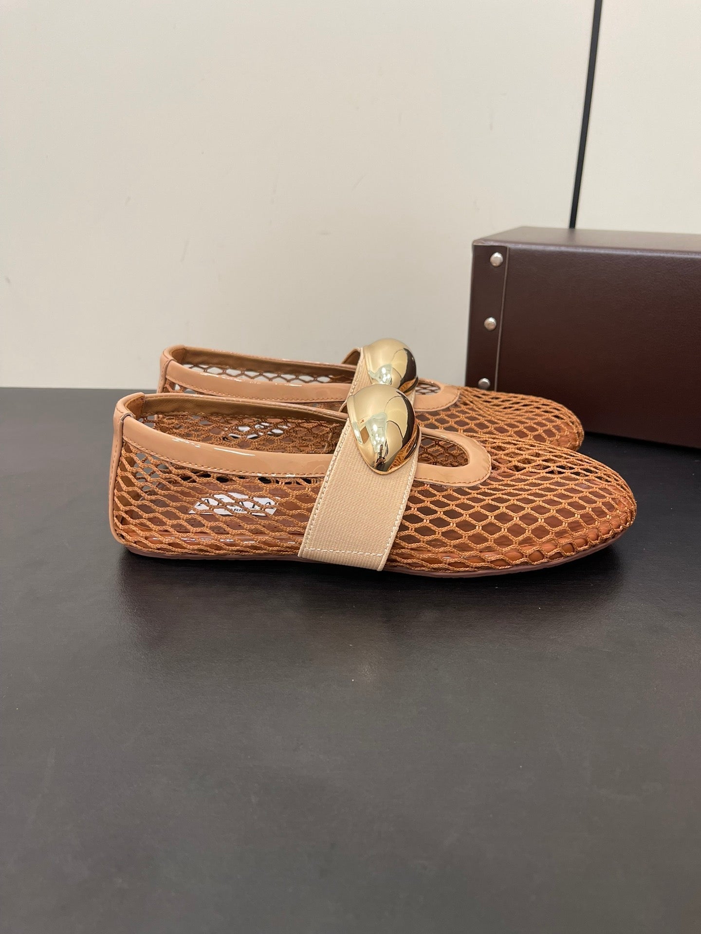 ALAIA BALLET FLATS IN COPPER BROWN MESH FISHNET WITH GOLD HARDWARE