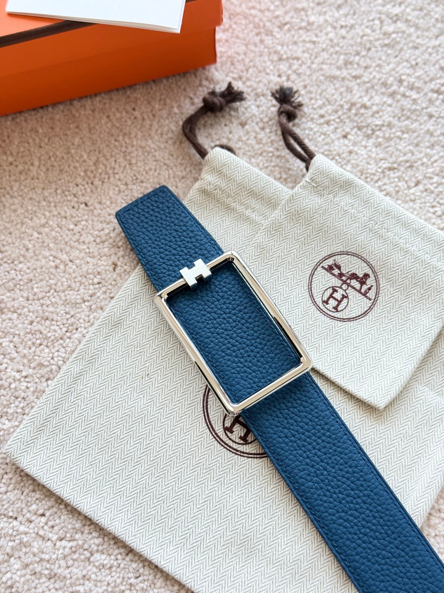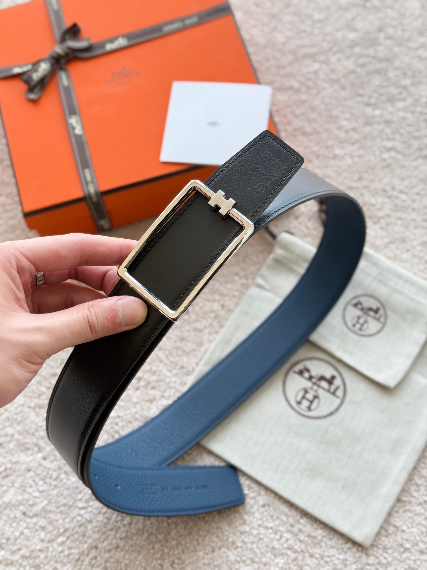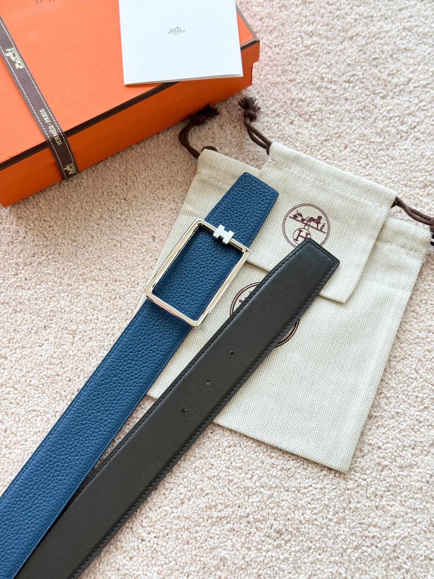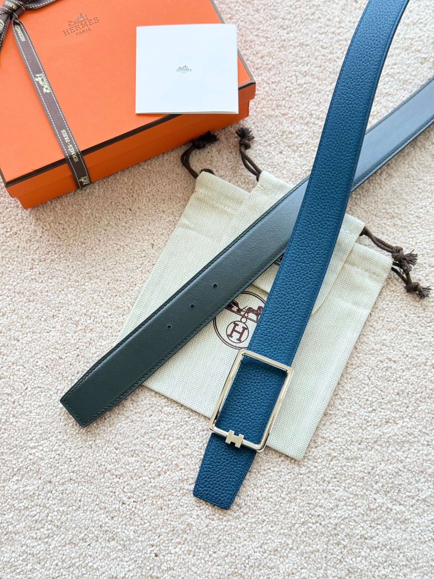 HM Silver Tube H Buckle Belt 38mm Prussian blue Black Leather 187523