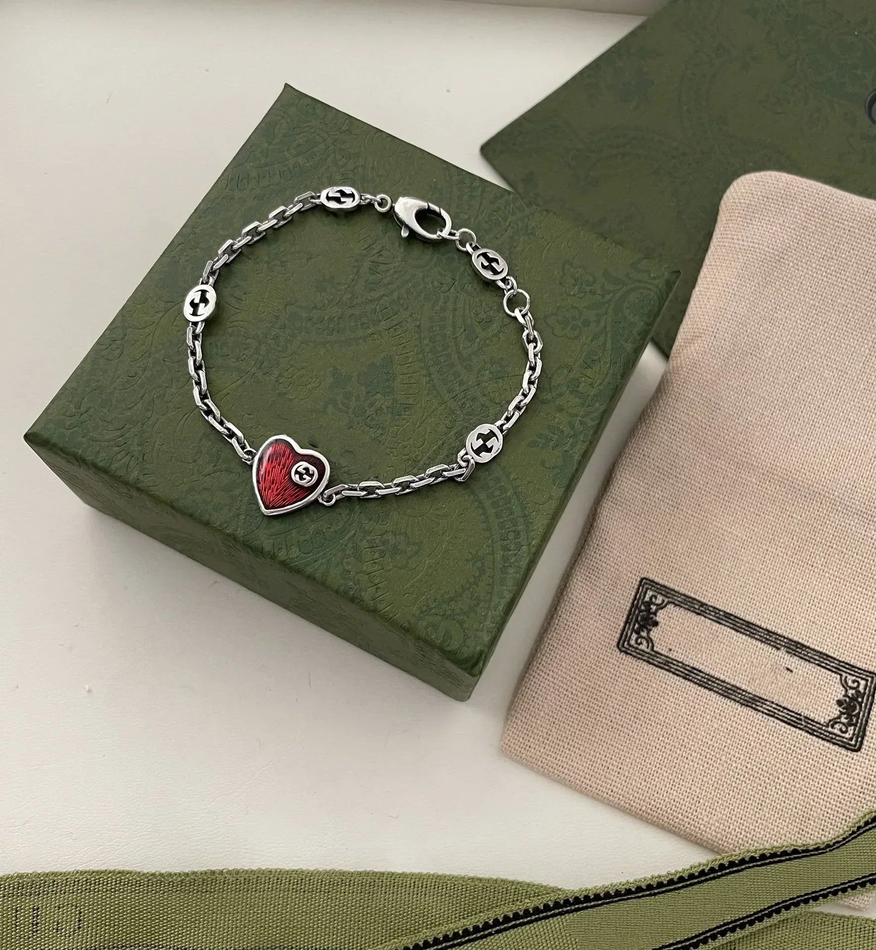 GG HEART AGED FINISH STERLING SILVER RED ENAMEL BRACELET