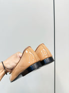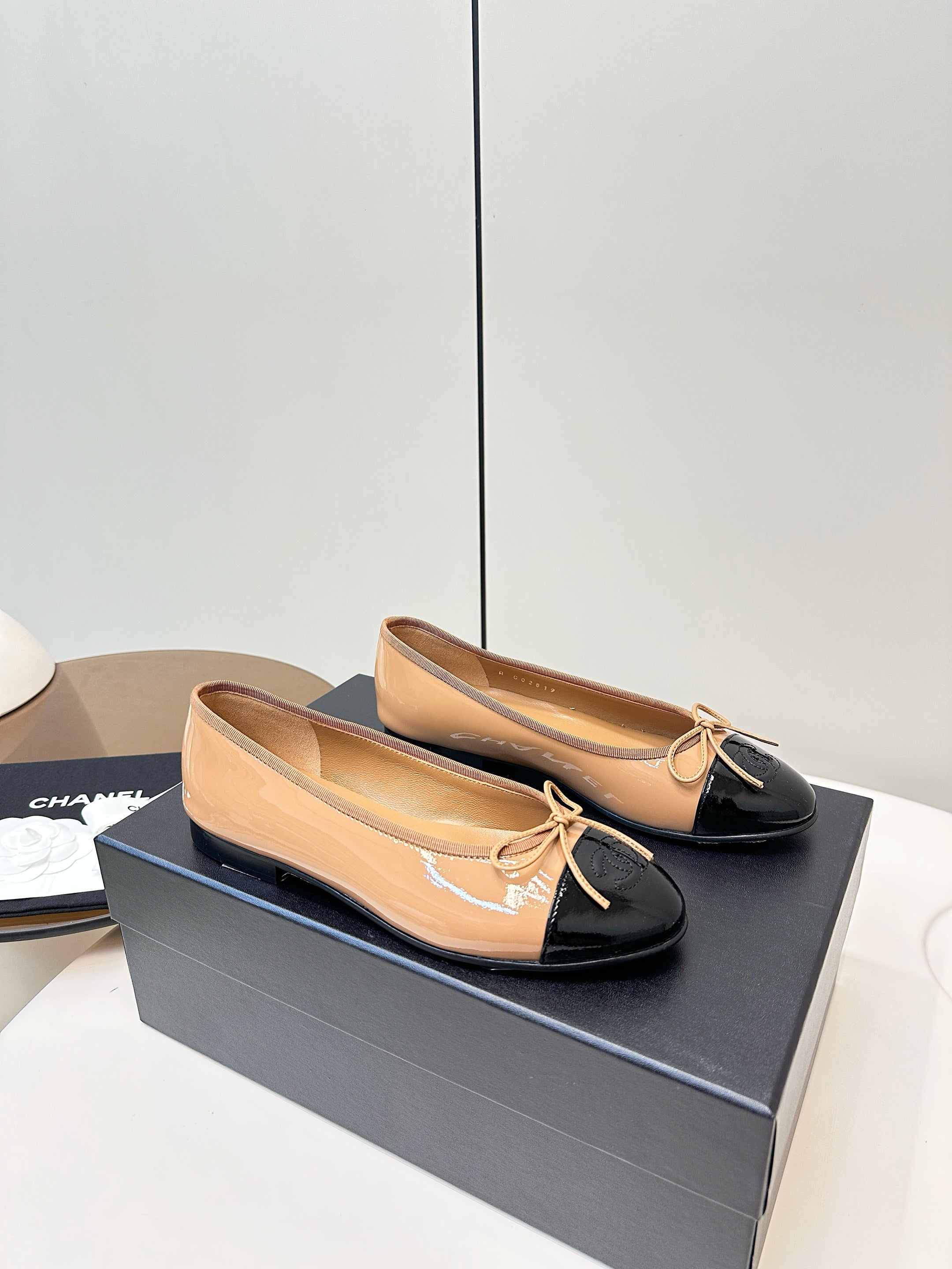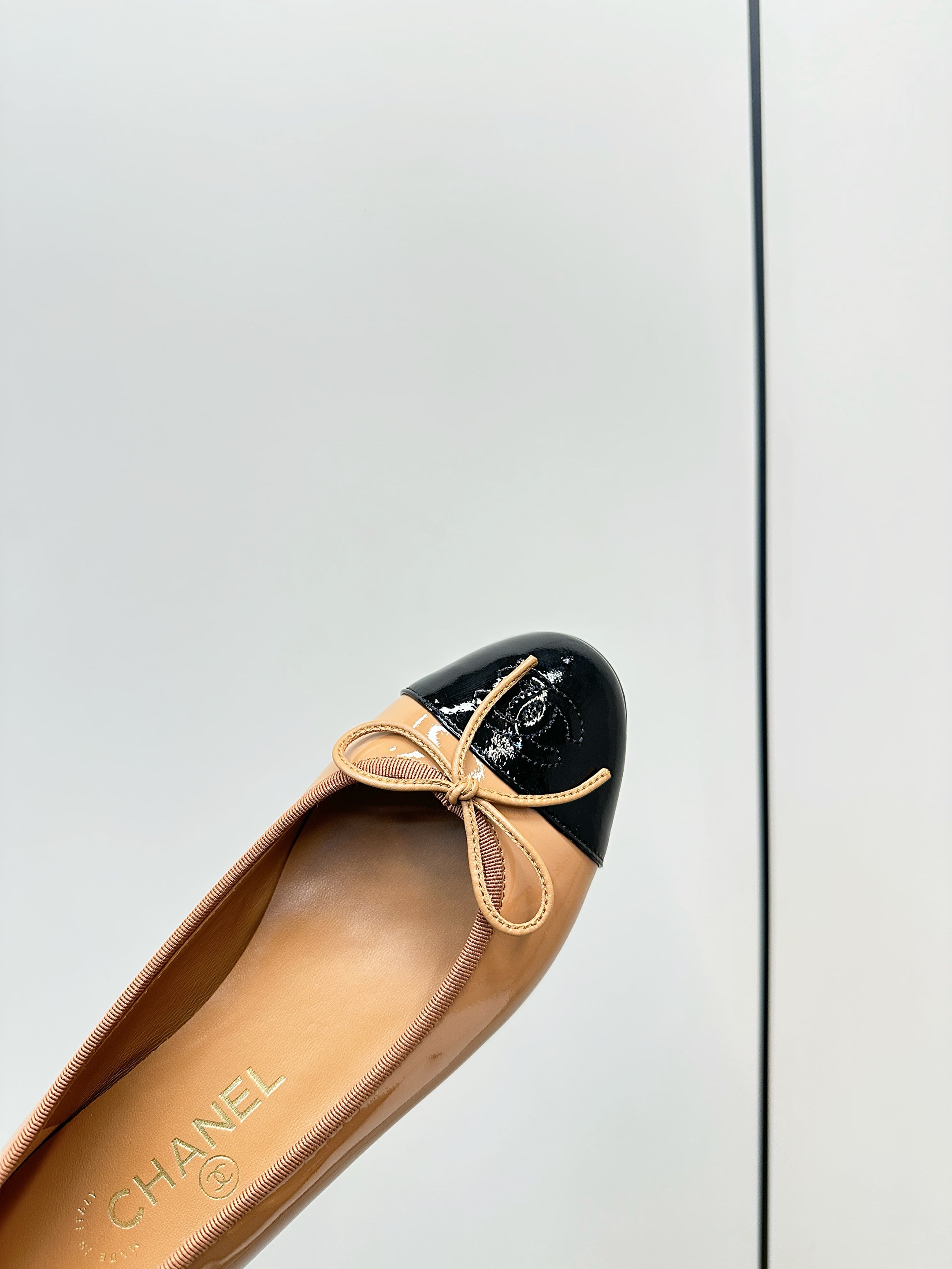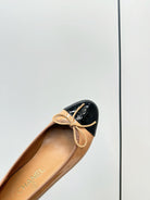 Chanel 25 Ballet Flat Tan Black Patent Leather 469255
