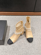 CC LOW CUT BOOTS IN SEPIA BEIGE STRETCH LAMBSKIN AND GROSGRAIN WITH PEARL CHAIN