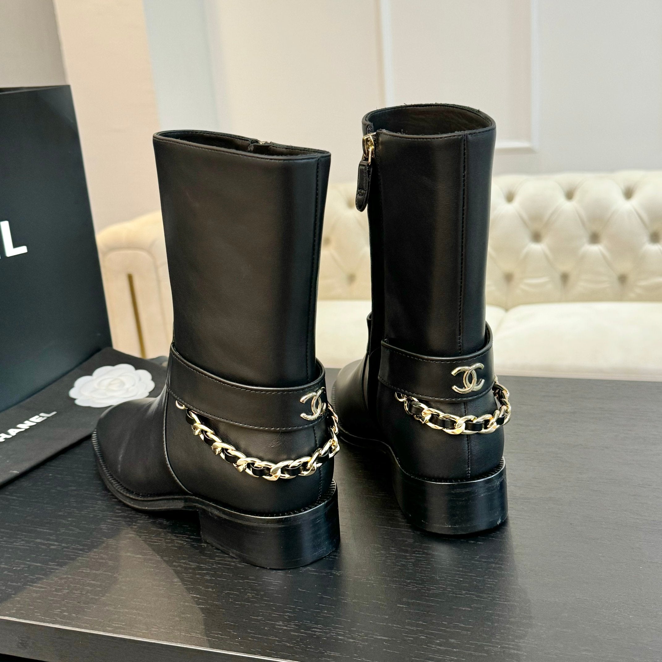 CC Short Boots 30mm Plain Black Chain Cowhide