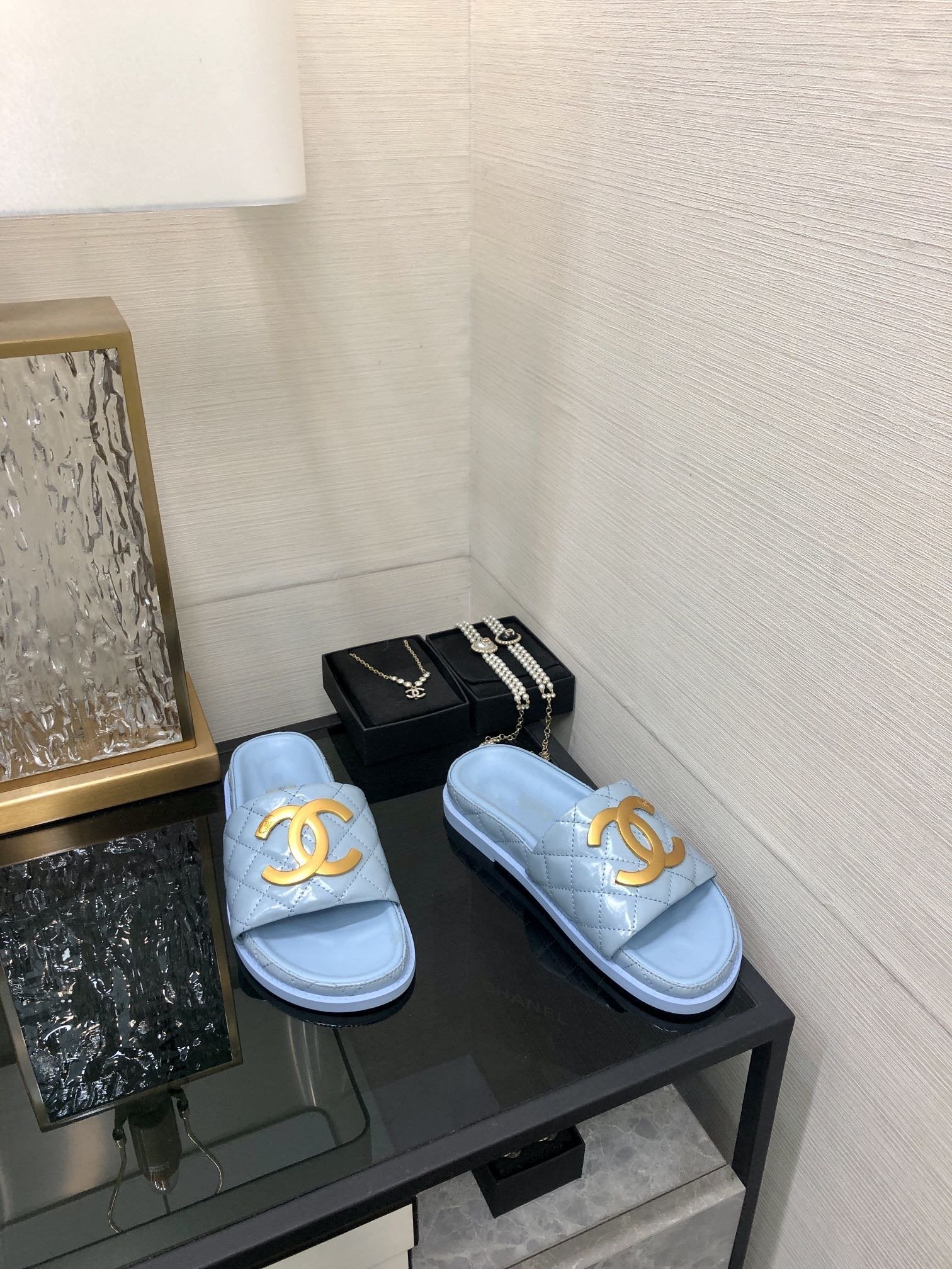 mule sandal 30 cloud blue quilted waxed leather