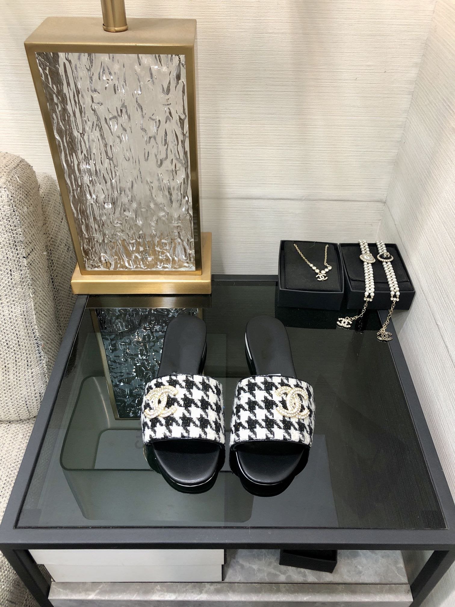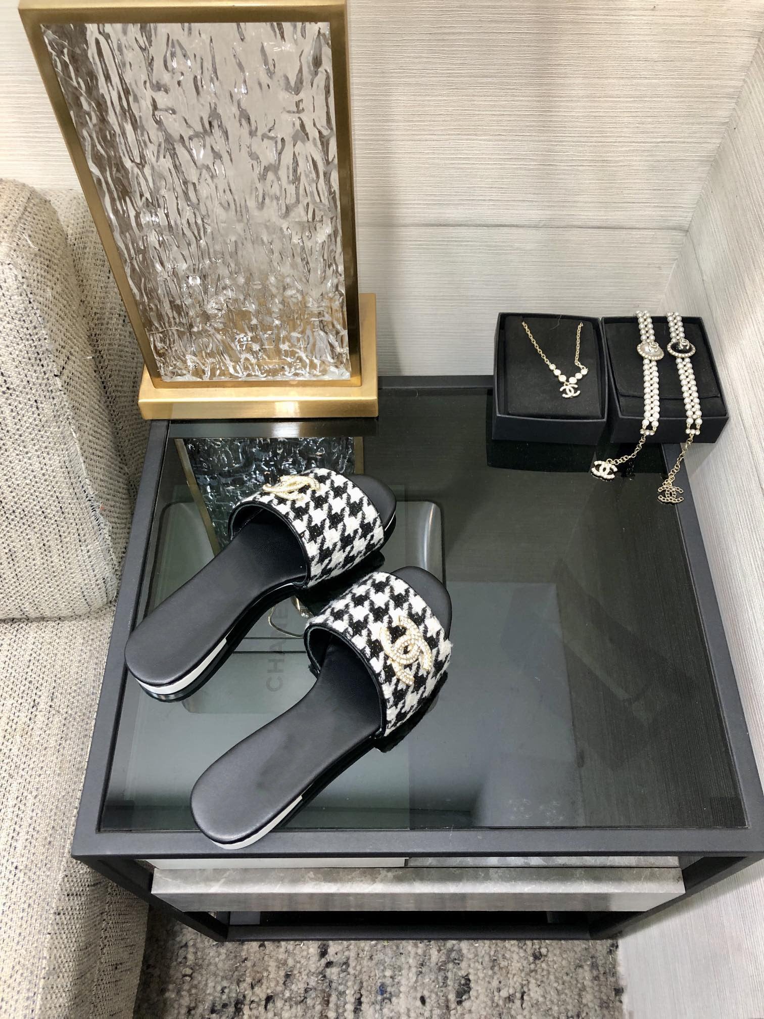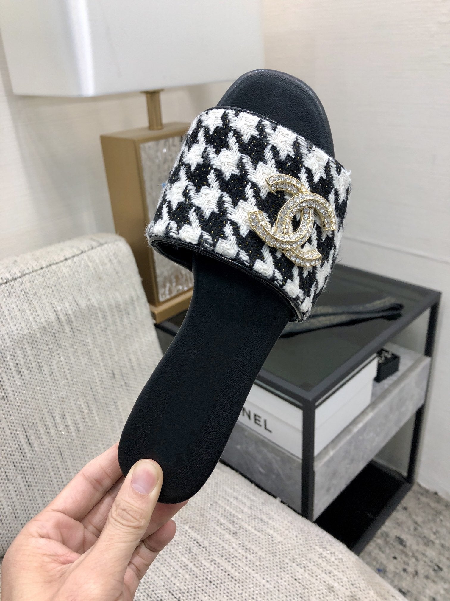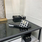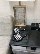 mule sandal black white houndstooth fabric