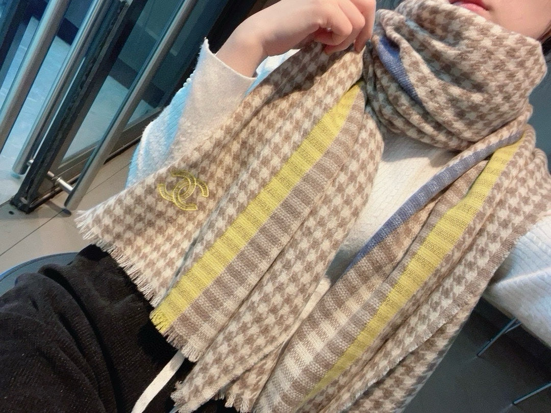 CC Scarf 190 CM In Brown White Mix Yellow Serrated Shape Cashmere 387911