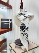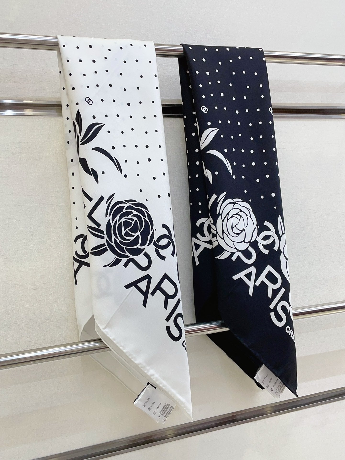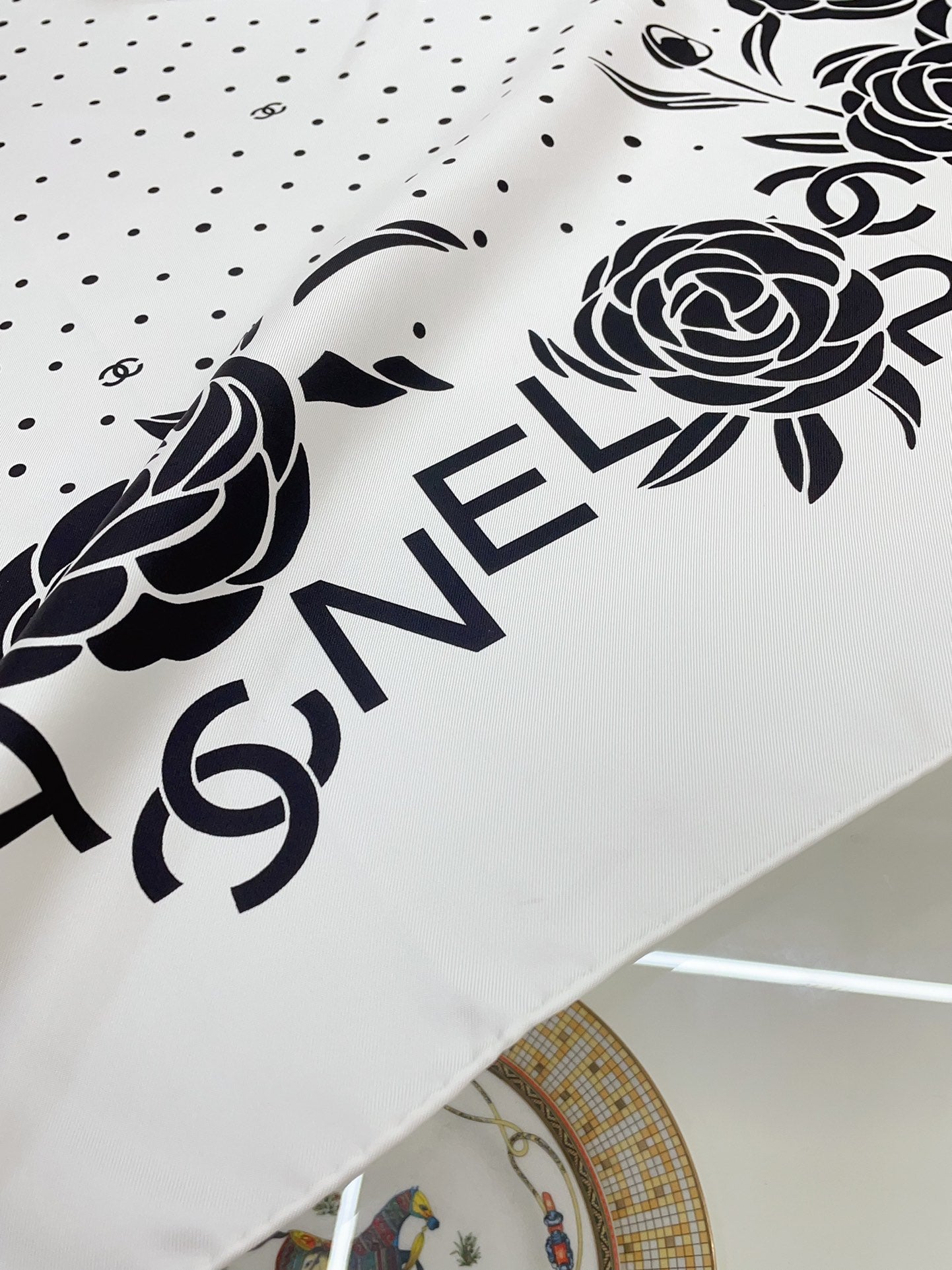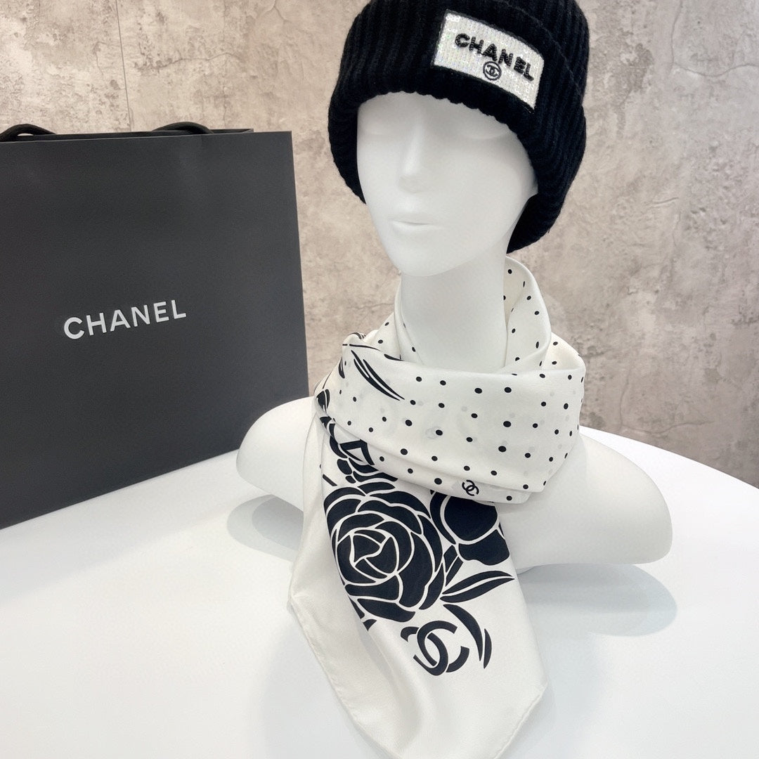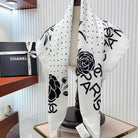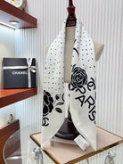 CC Square Scarf 90 CM In White Polka Dot Black Camellia Silk Twill 288722