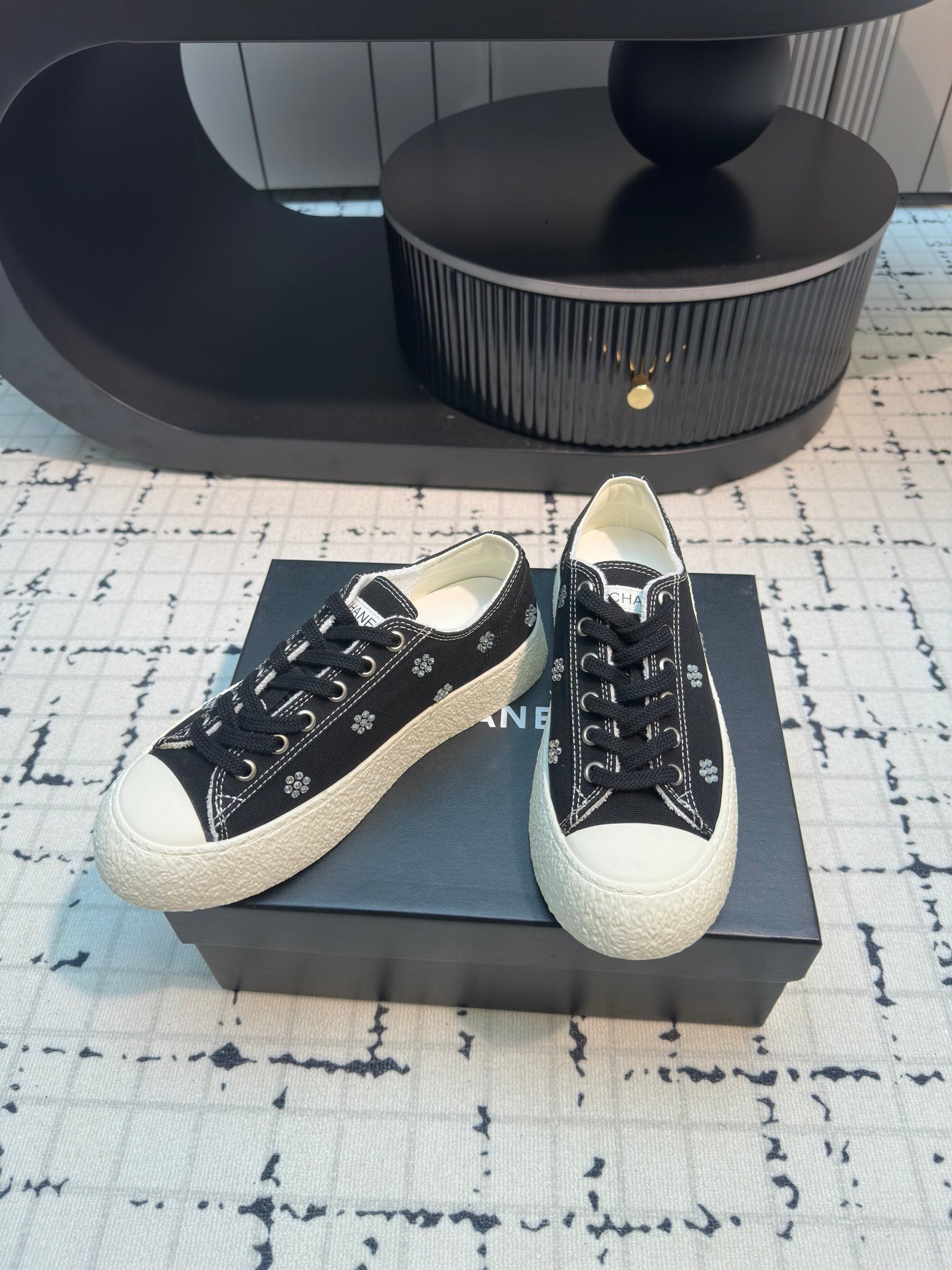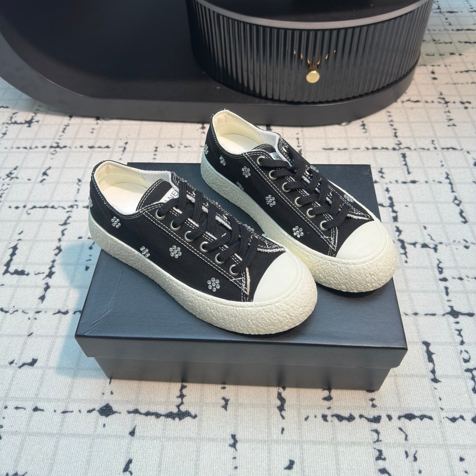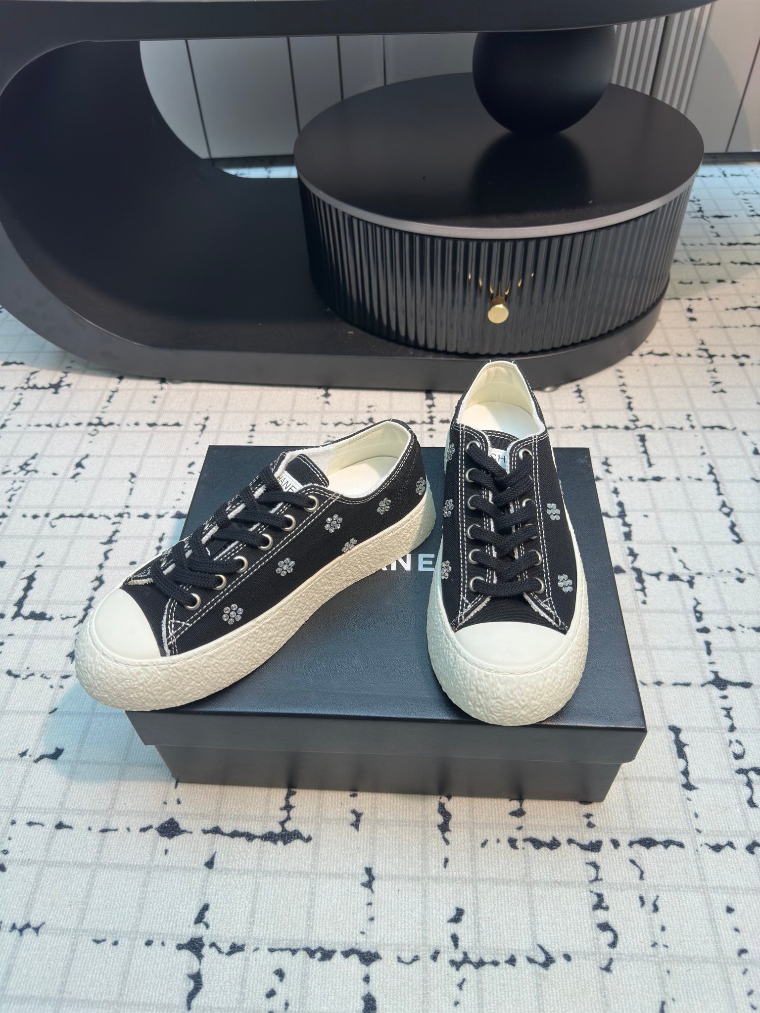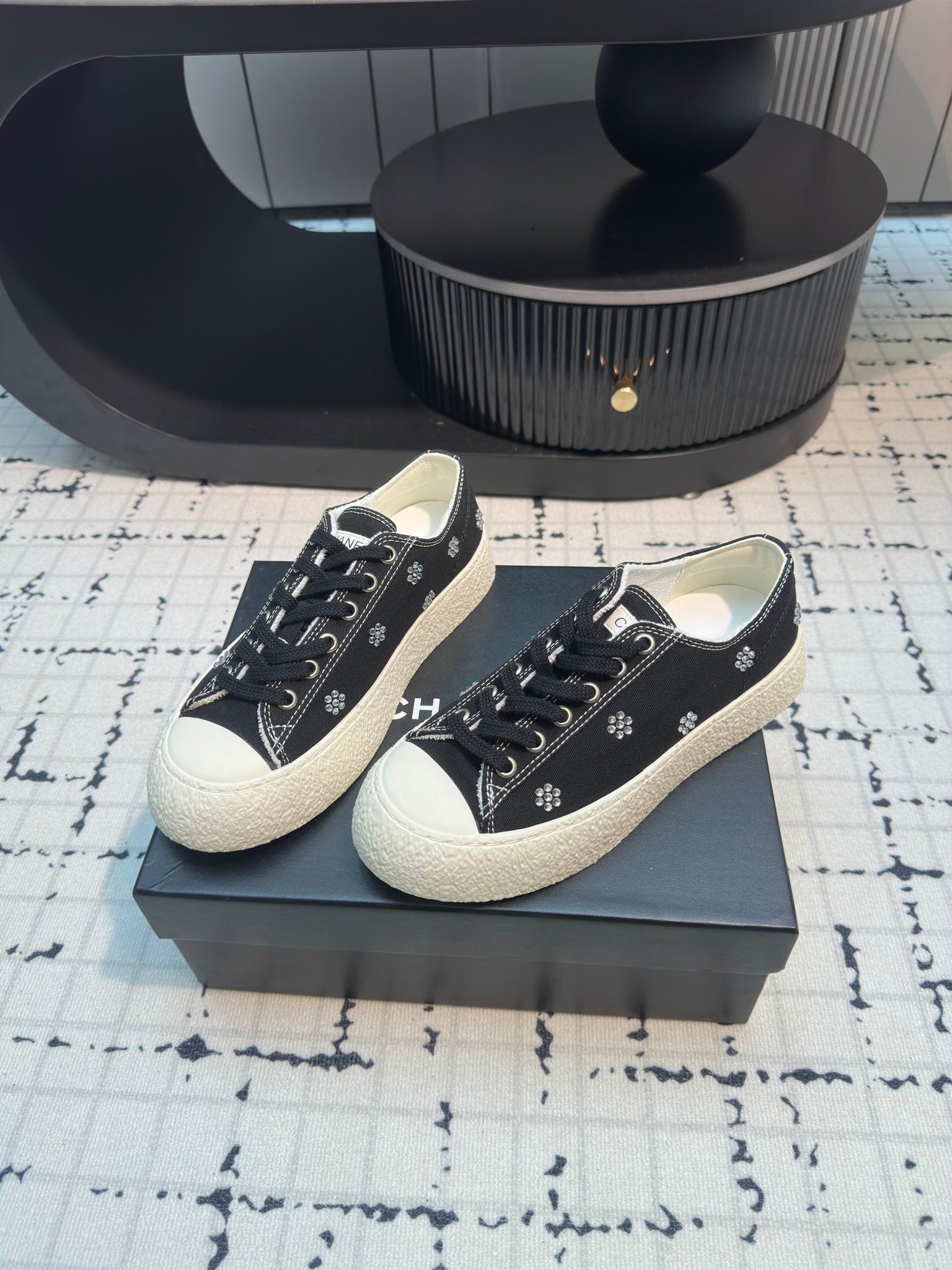 CC Low Sneaker 30mm Black Mix White With Small Flowers Cavas Fabric