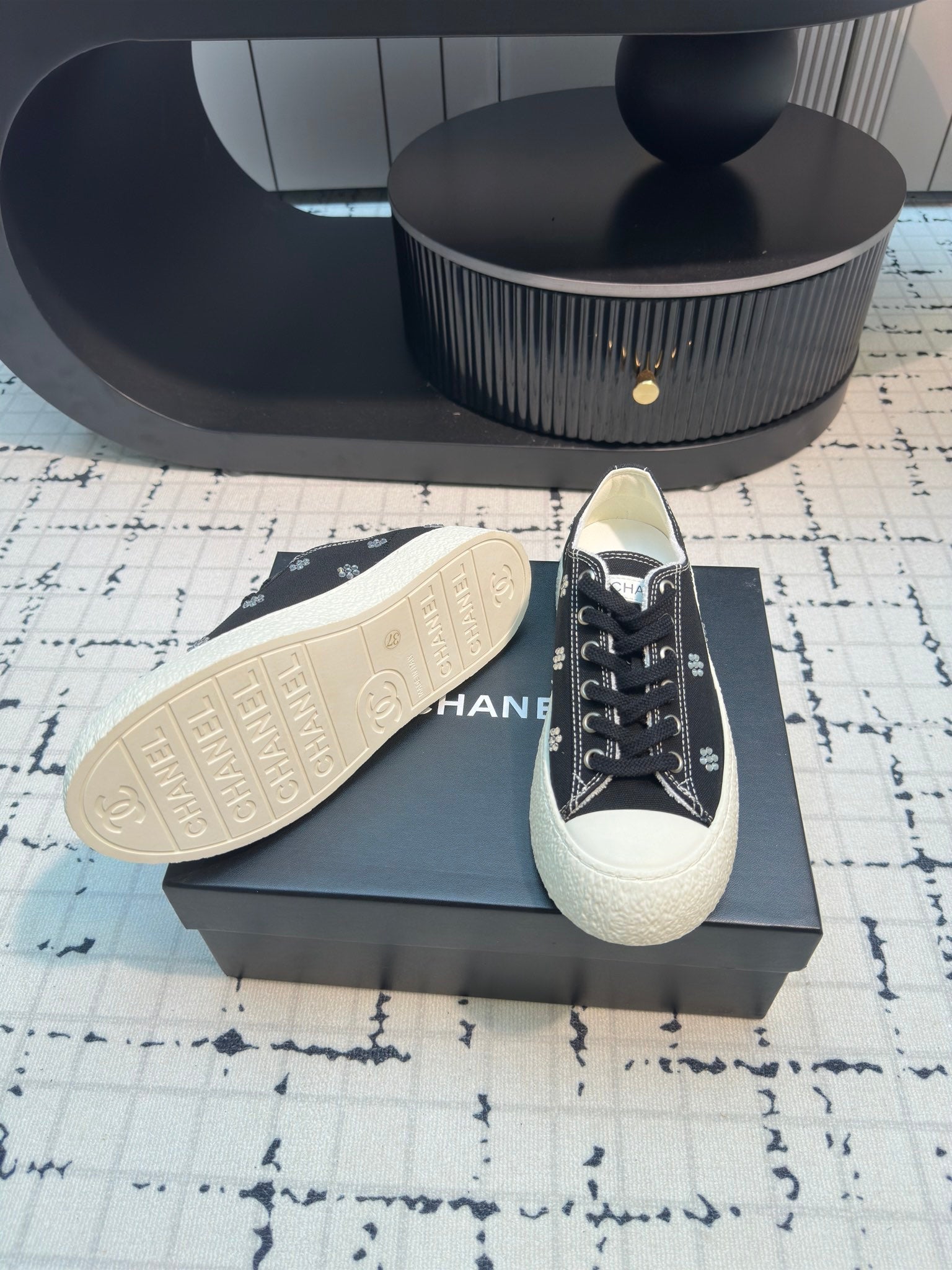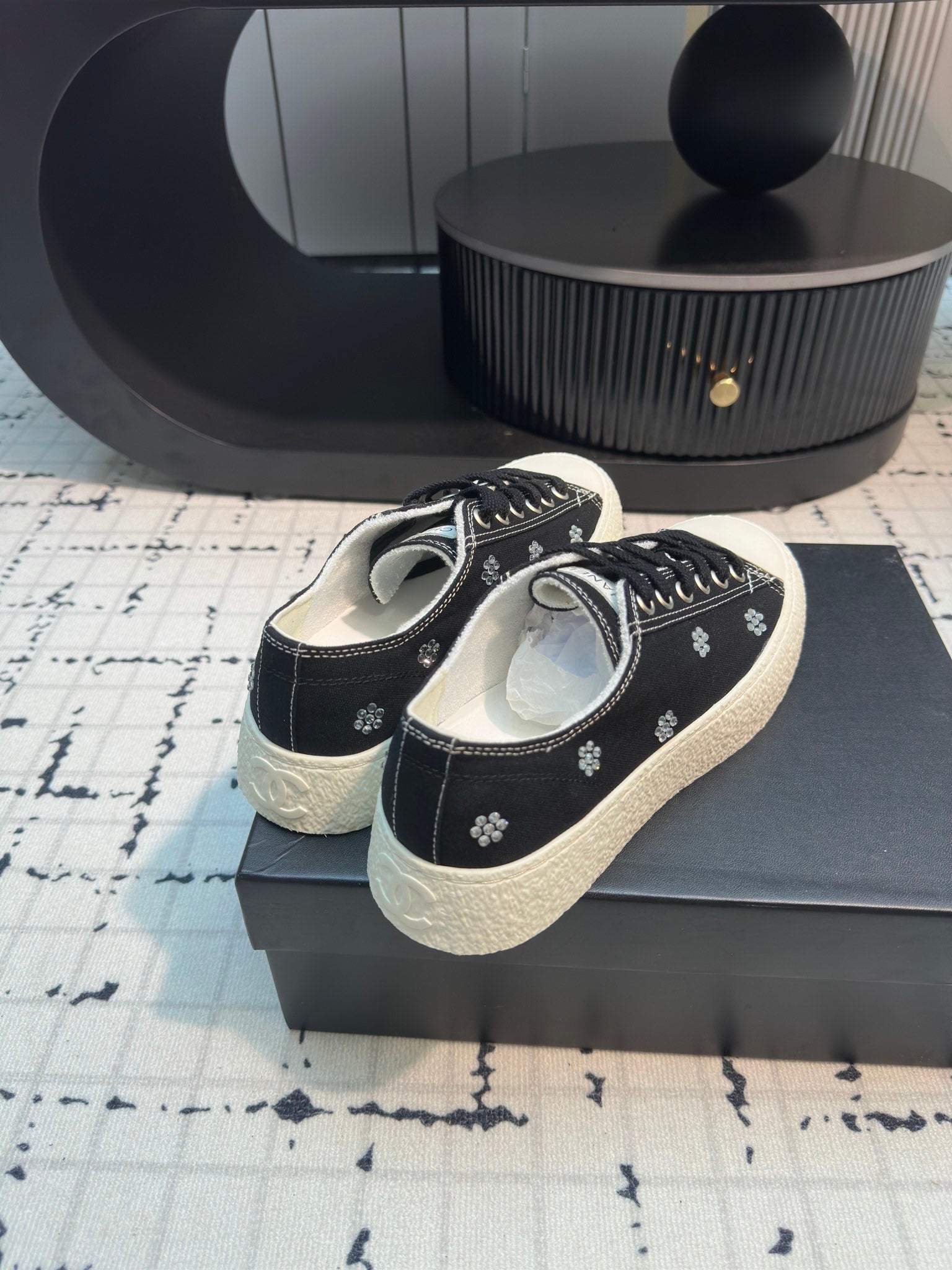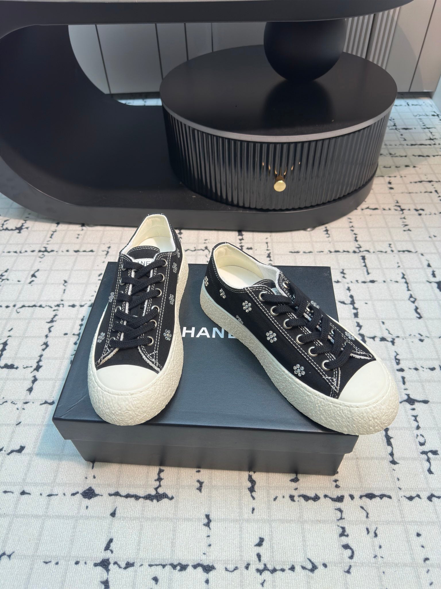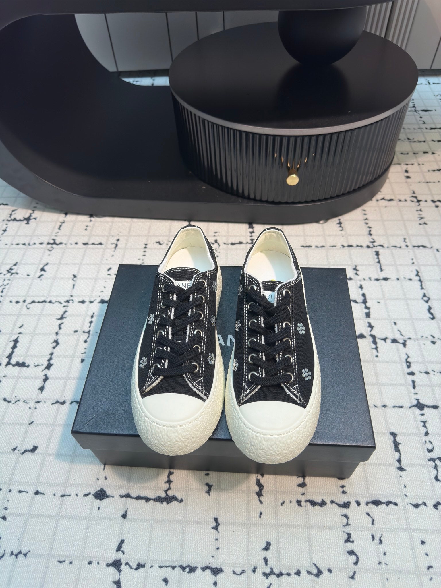 CC Low Sneaker 30mm Black Mix White With Small Flowers Cavas Fabric