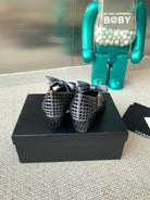 CC MARY JANES SHOES IN STEEL GRAY SATIN WITH BLACK RHINESTONES