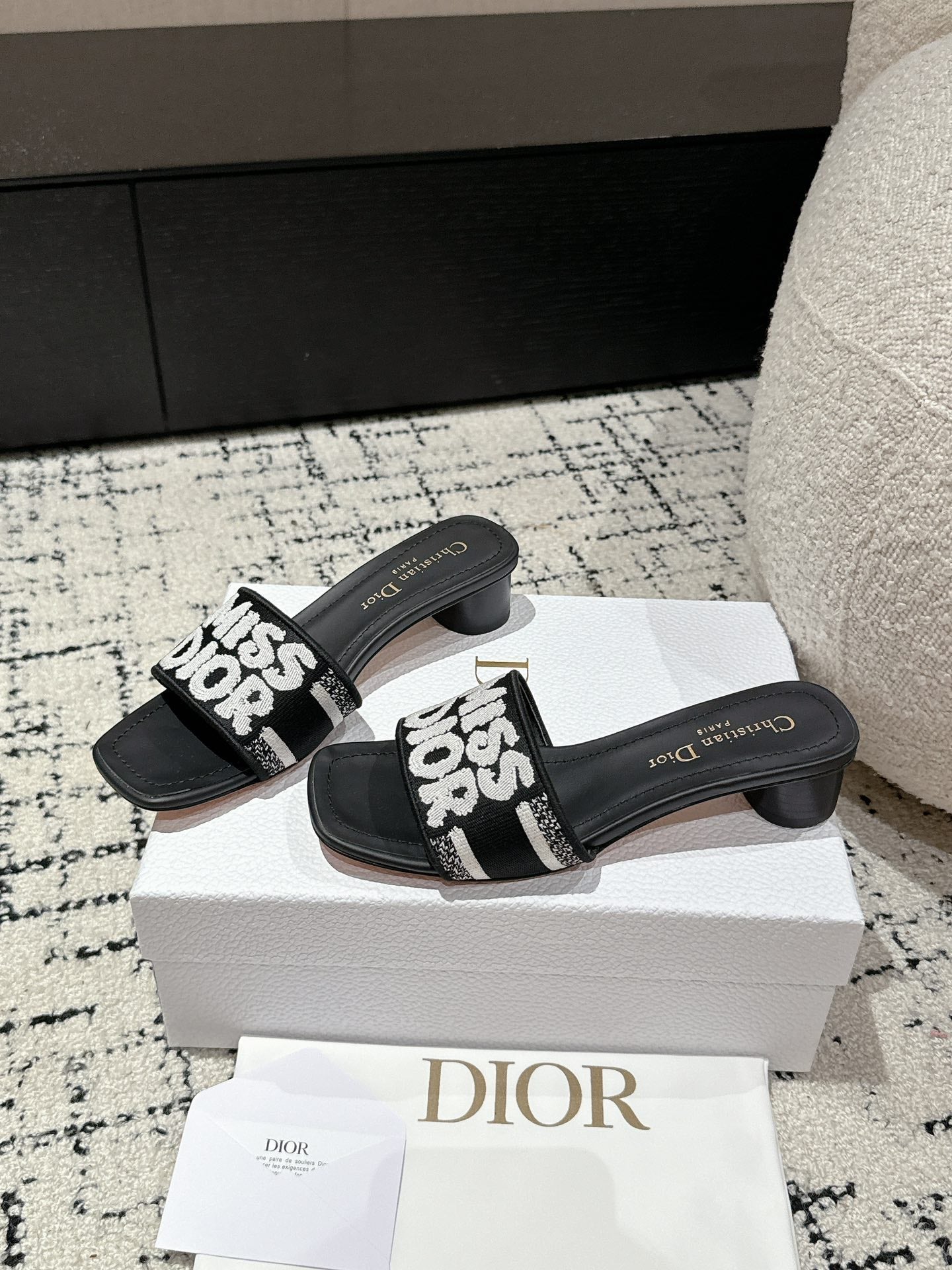 CD Dway Heeled Slide Black Mix White Embroidered Cotton
