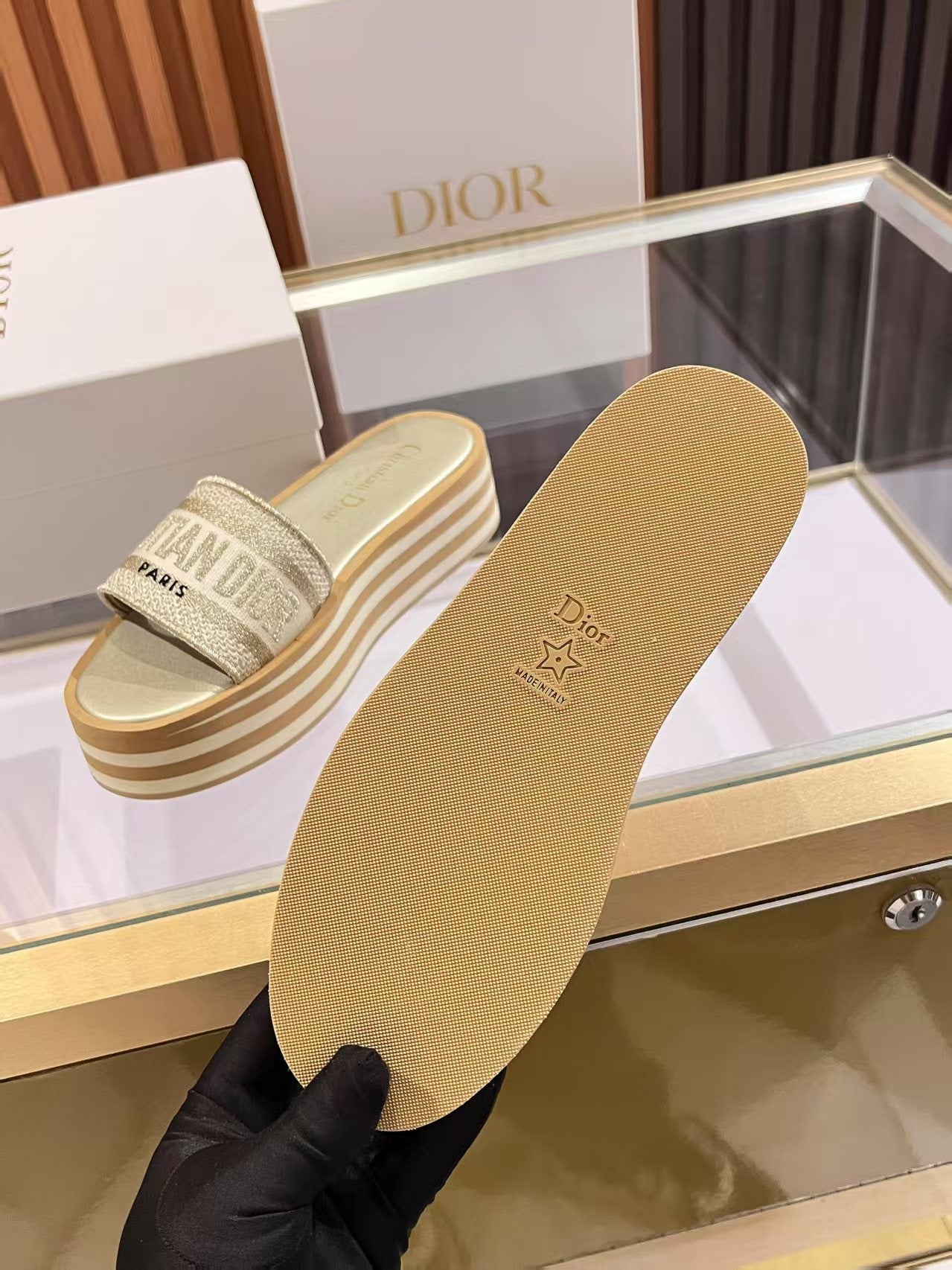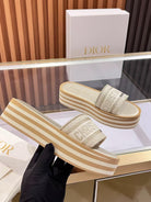 CD Dway Platform Slide Beige Brown Fabric with Lambskin 242442