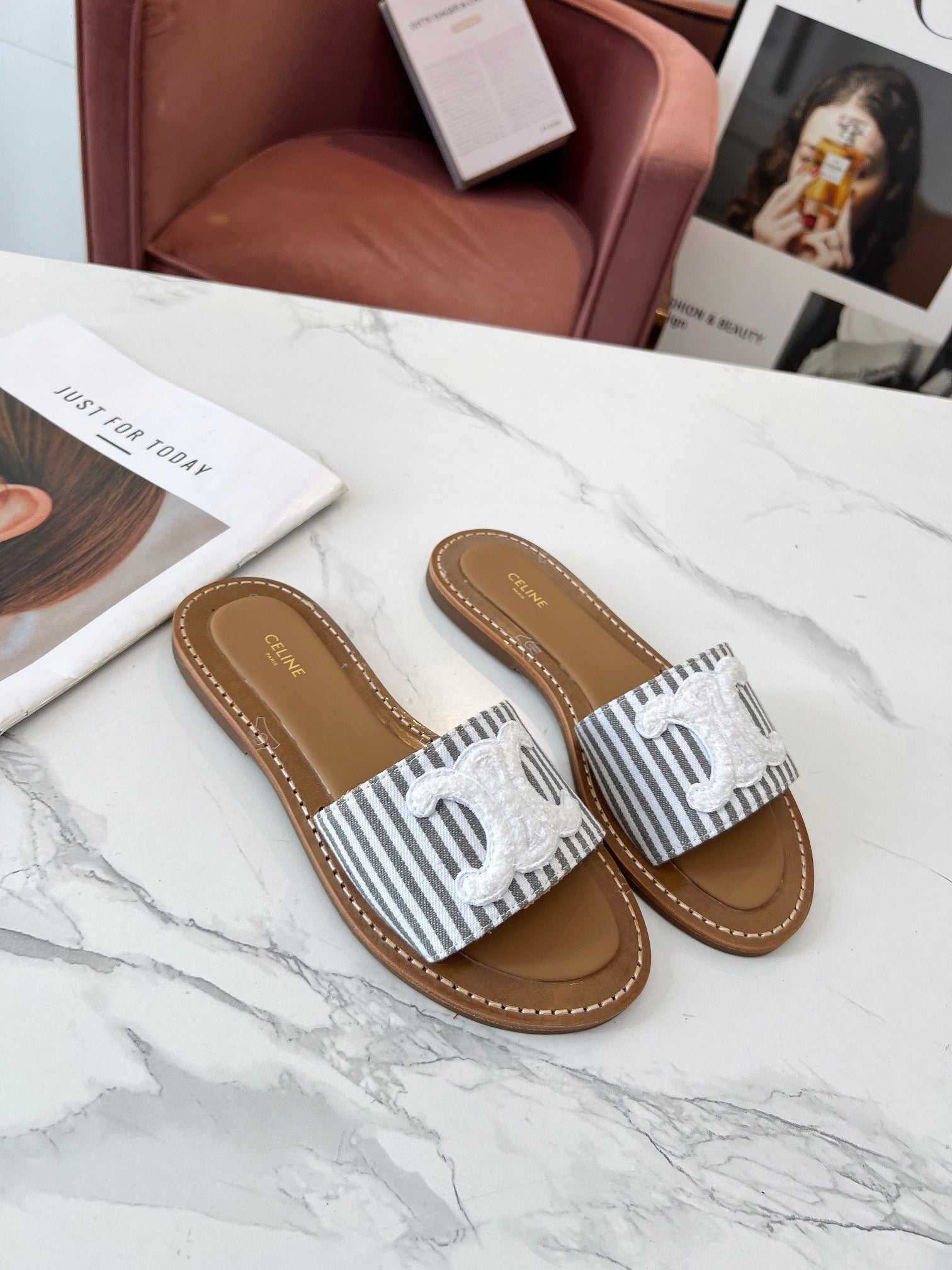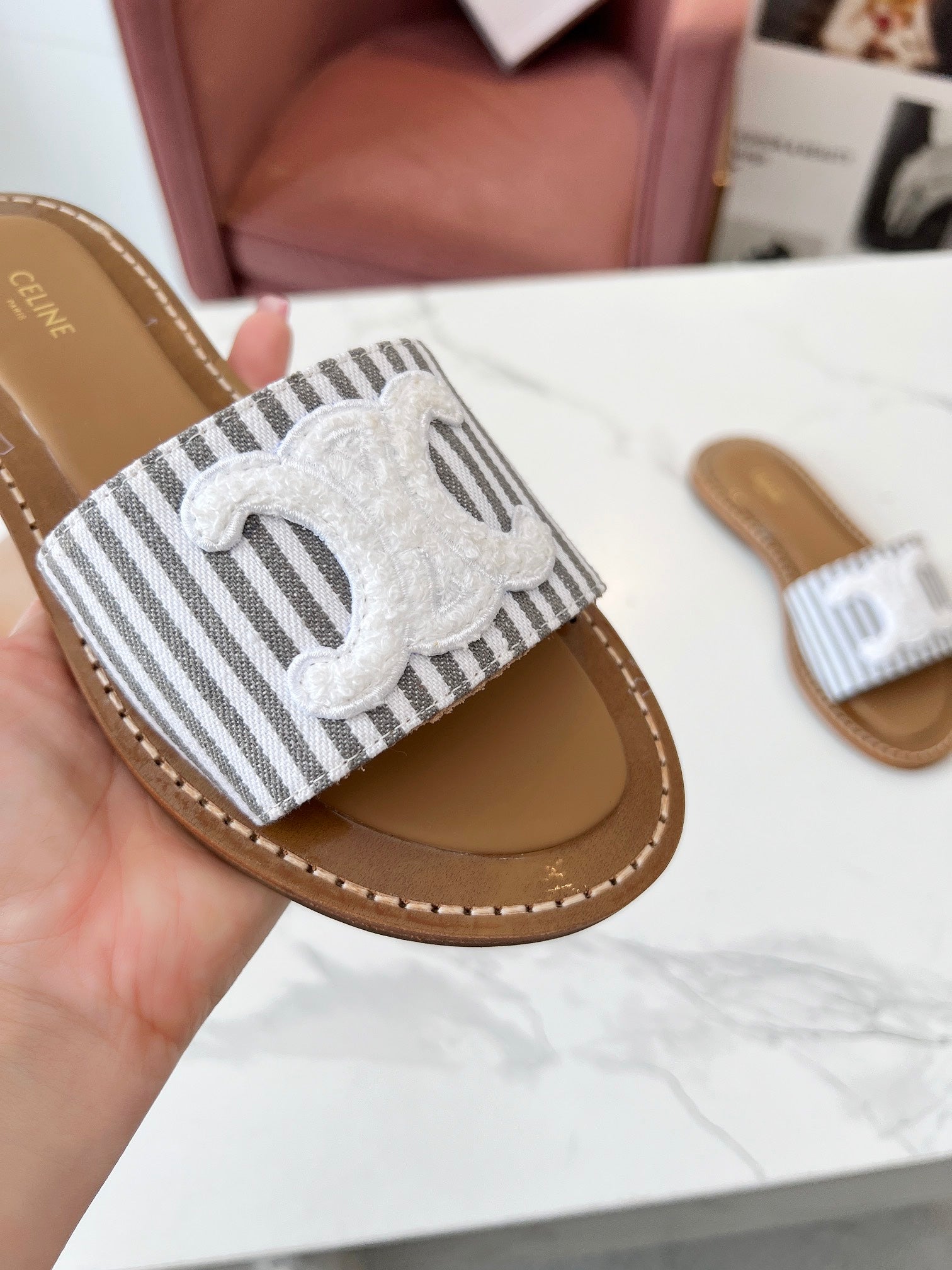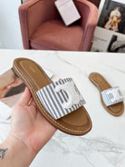 Celine 25C Slippers Gray mix White Fabric with Calfskin 238171