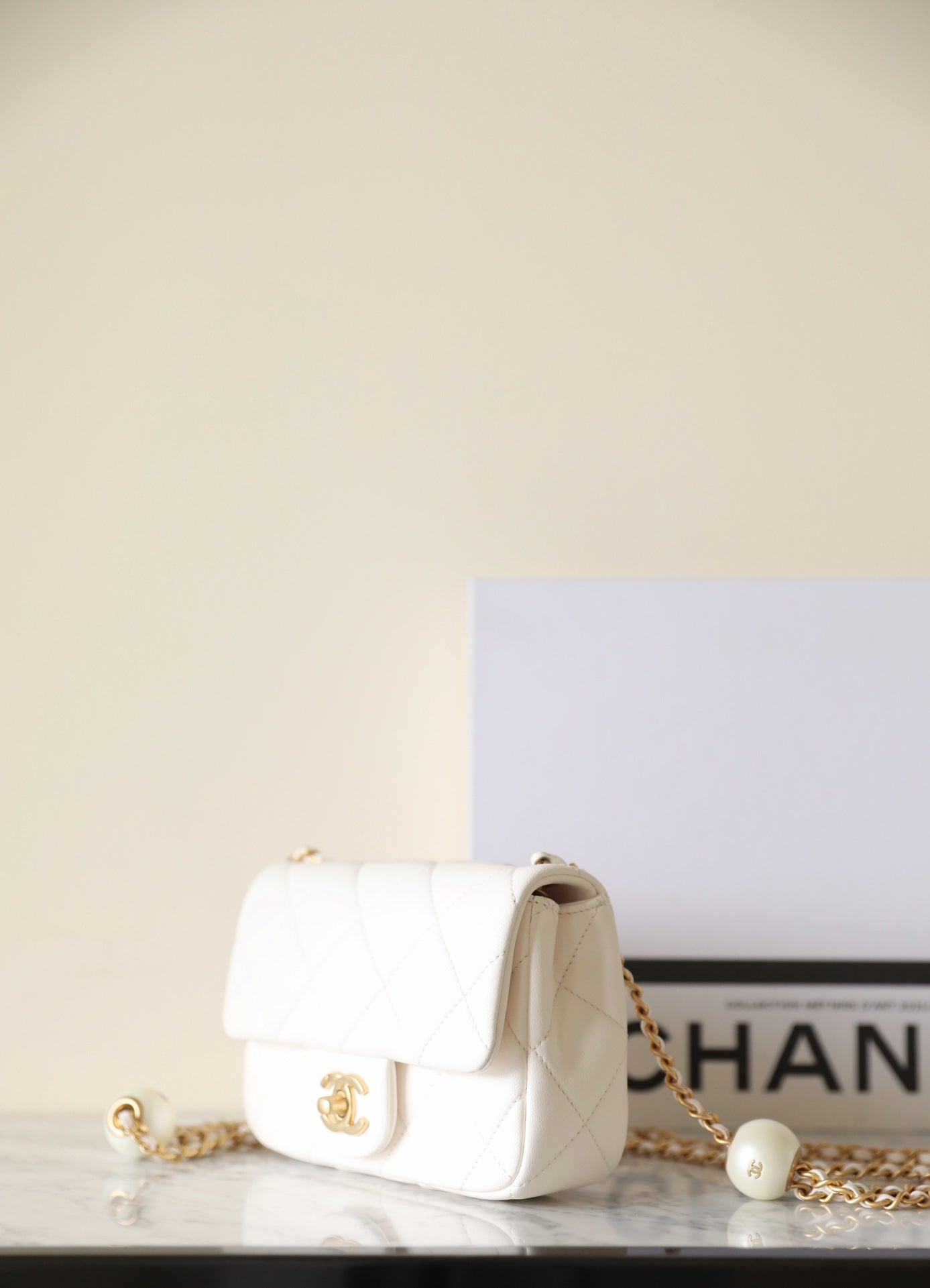 cc 24s mini flap bag 17cm white lambskin pearl ball