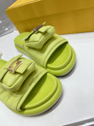 FENDI BAGUETTE SLIPPERS IN PEAR GREEN LAMBSKIN WITH GOLD HARDWARE