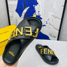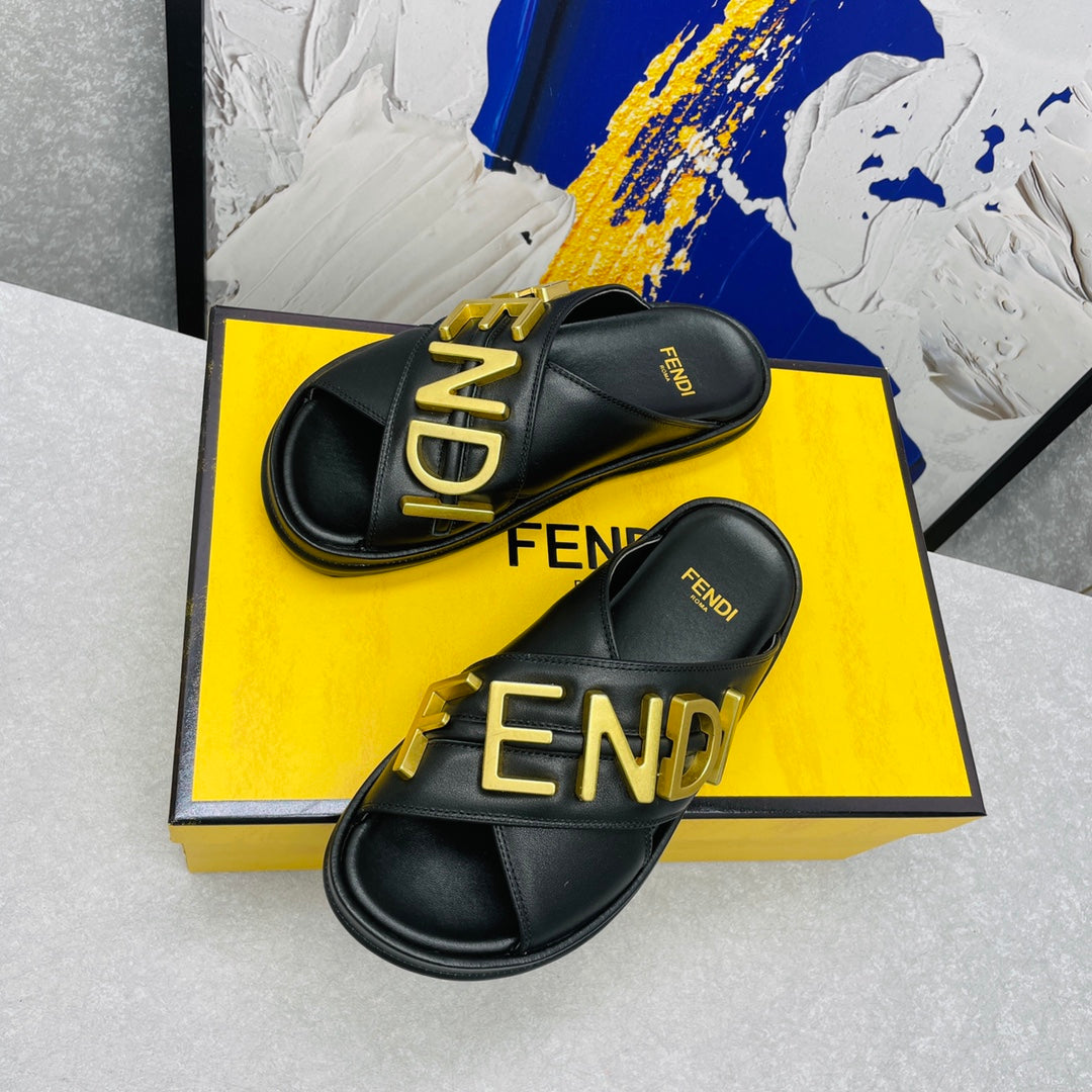 FENDI GRAPHY LOGO LETTERING SLIDES IN BLACK LAMBSKIN WITH GOLD HARDWARE