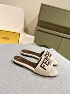 FENDI SIGNATURE MULE SLIDES IN WHITE FIBRE WITH BROWN EMBROIDERED LOGO