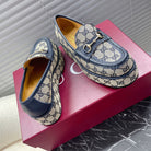 HORSEBIT PLATFORM LOAFER IN TAN BEIGEMONOGRAM JACQUARD FABRIC AND NAVY BLUE CALFSKIN