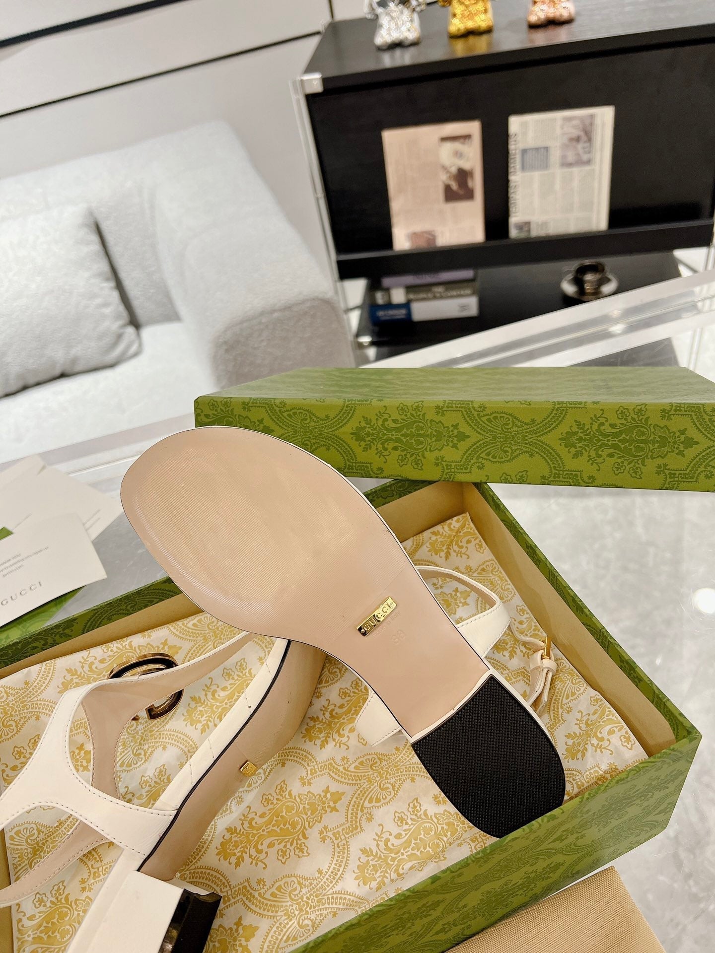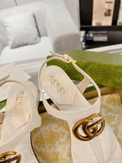 GC Double G Block Heel Thong Sandals White Leather 292408