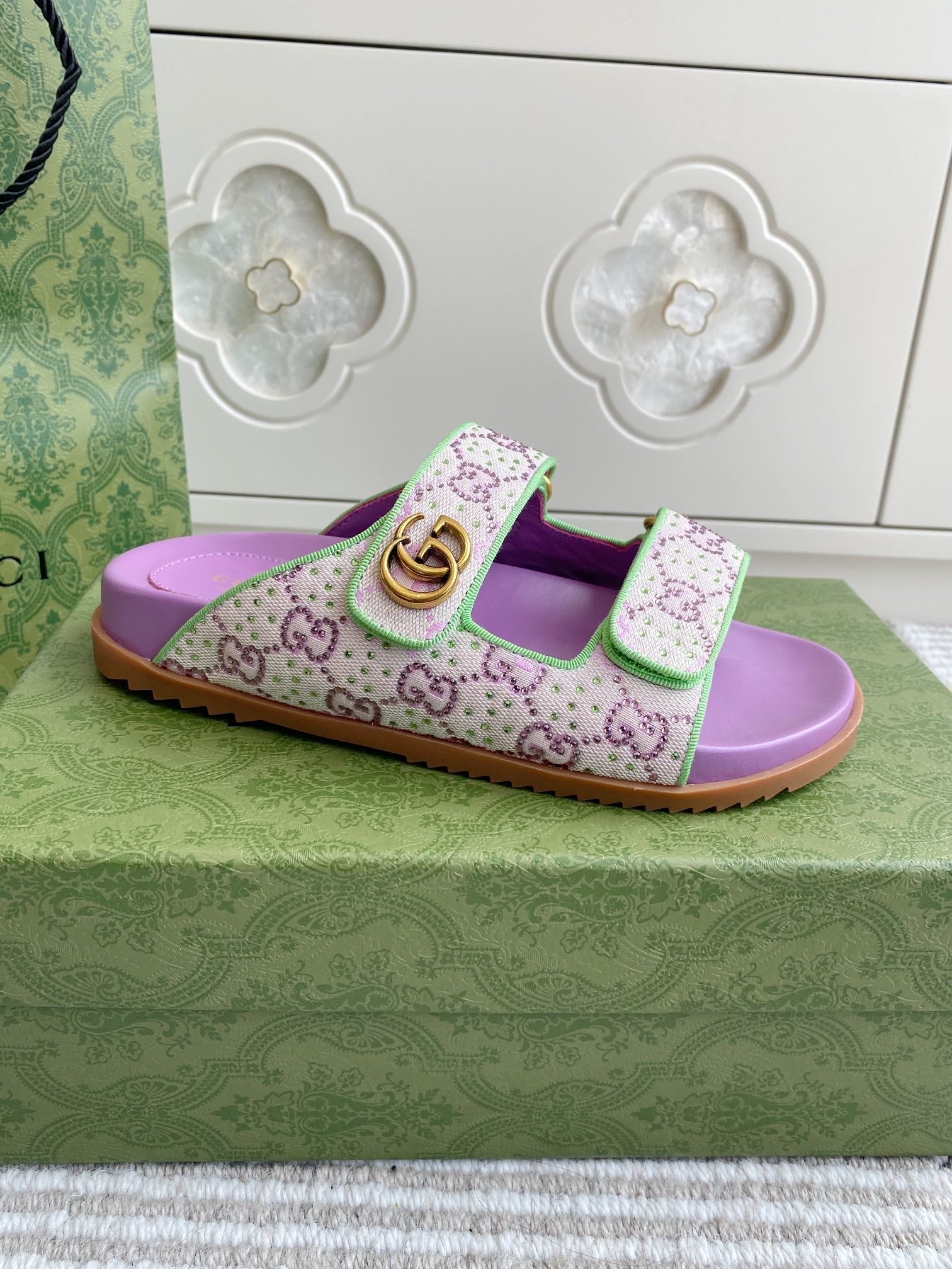 GC sandal with Double G Purple Canvas Sheepskin 291018
