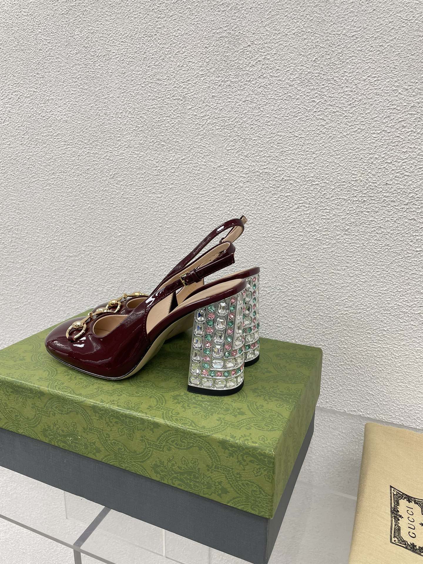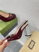GG WOMEN'S HORSEBIT SLINGBACK 95MM IN WINE RED CALFSKIN WITH RHINSTONES