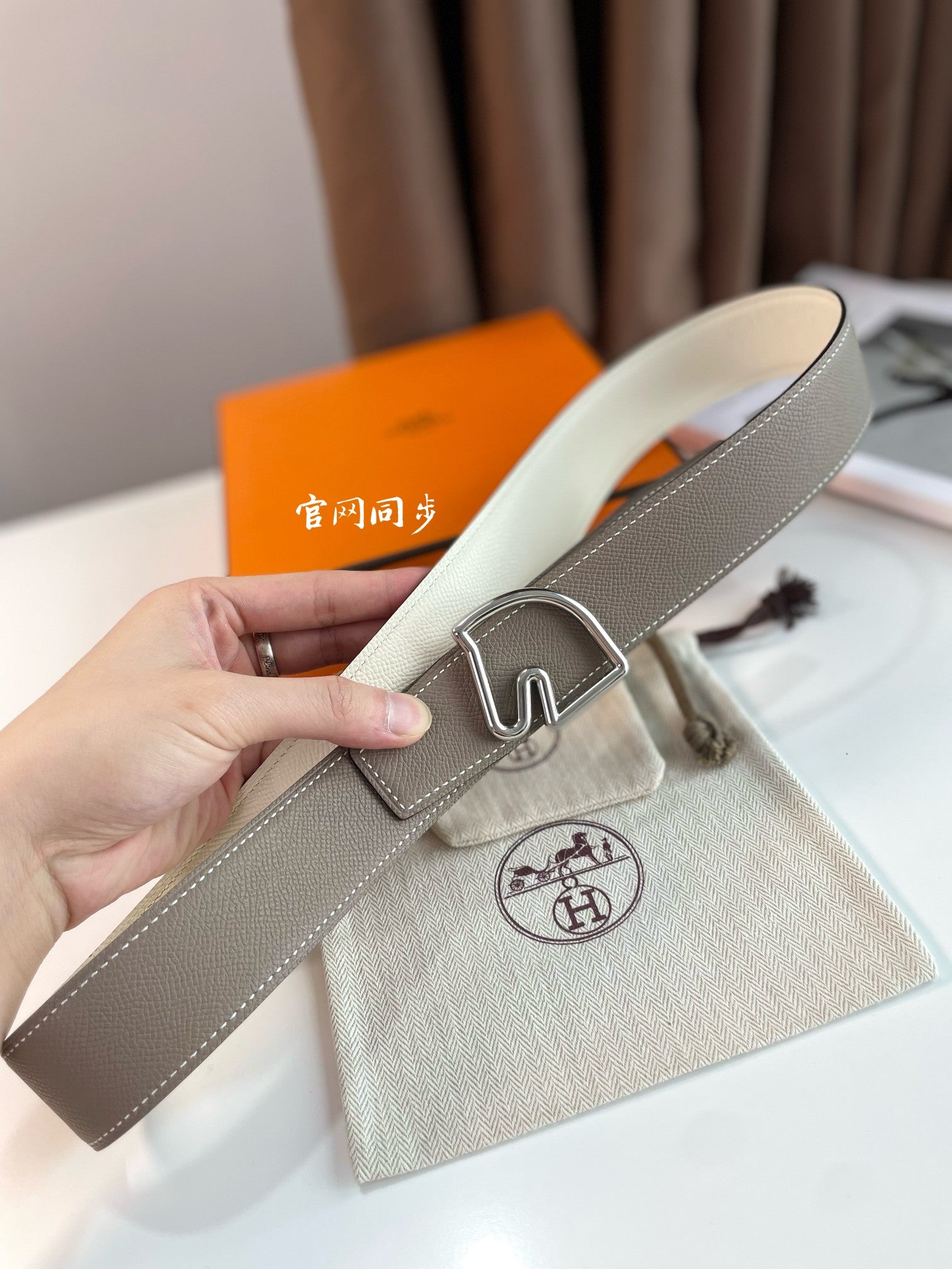 BOUCLE BELT BUCKLE & REVERSIBLE KHAKI BROWN AND WHITE LEATHER STRAP 38MM SILVER HARDWARE