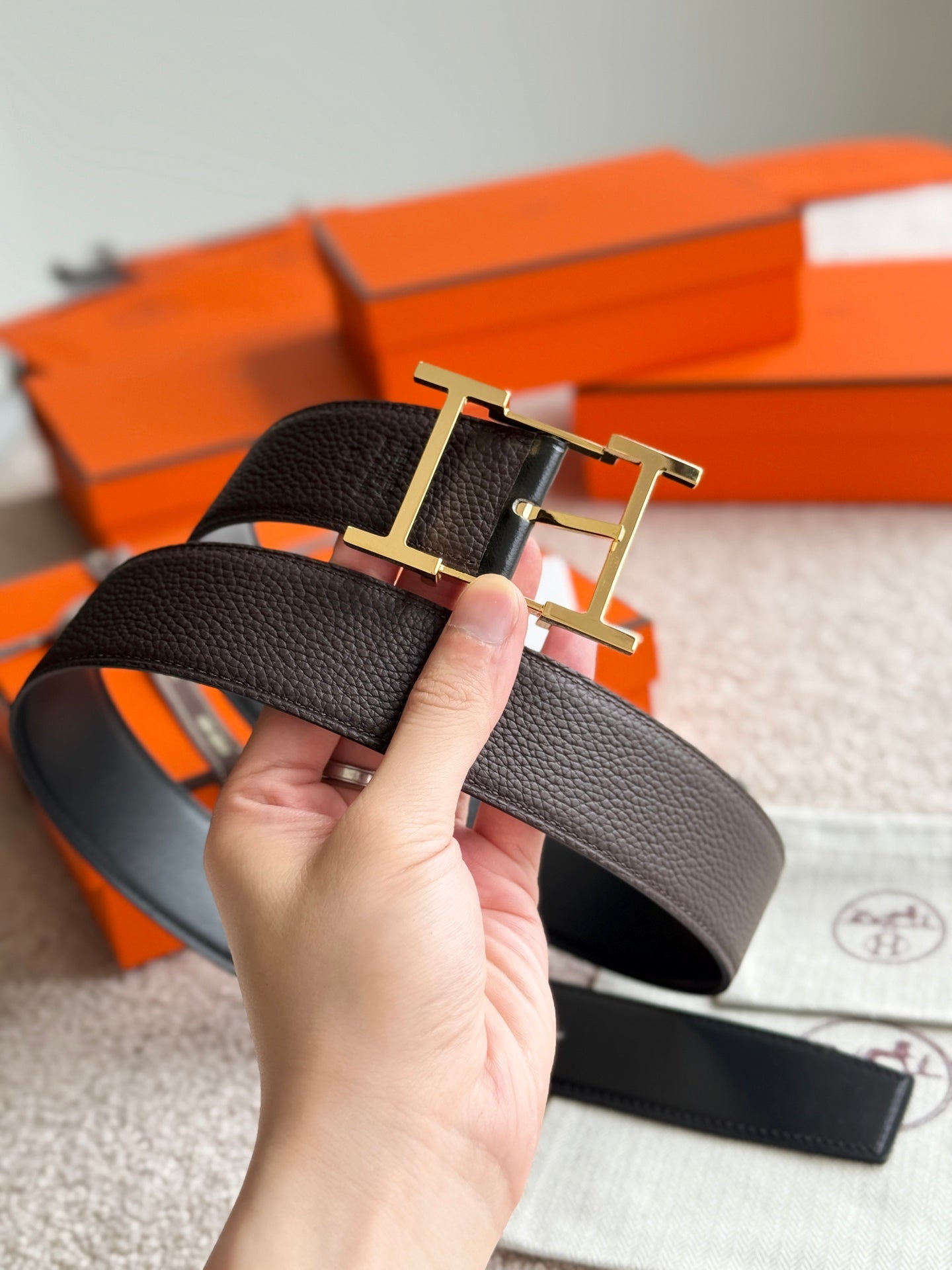 HM Gold Hadrien Reversible 38mm Belt Black Chocolate Leather 188080