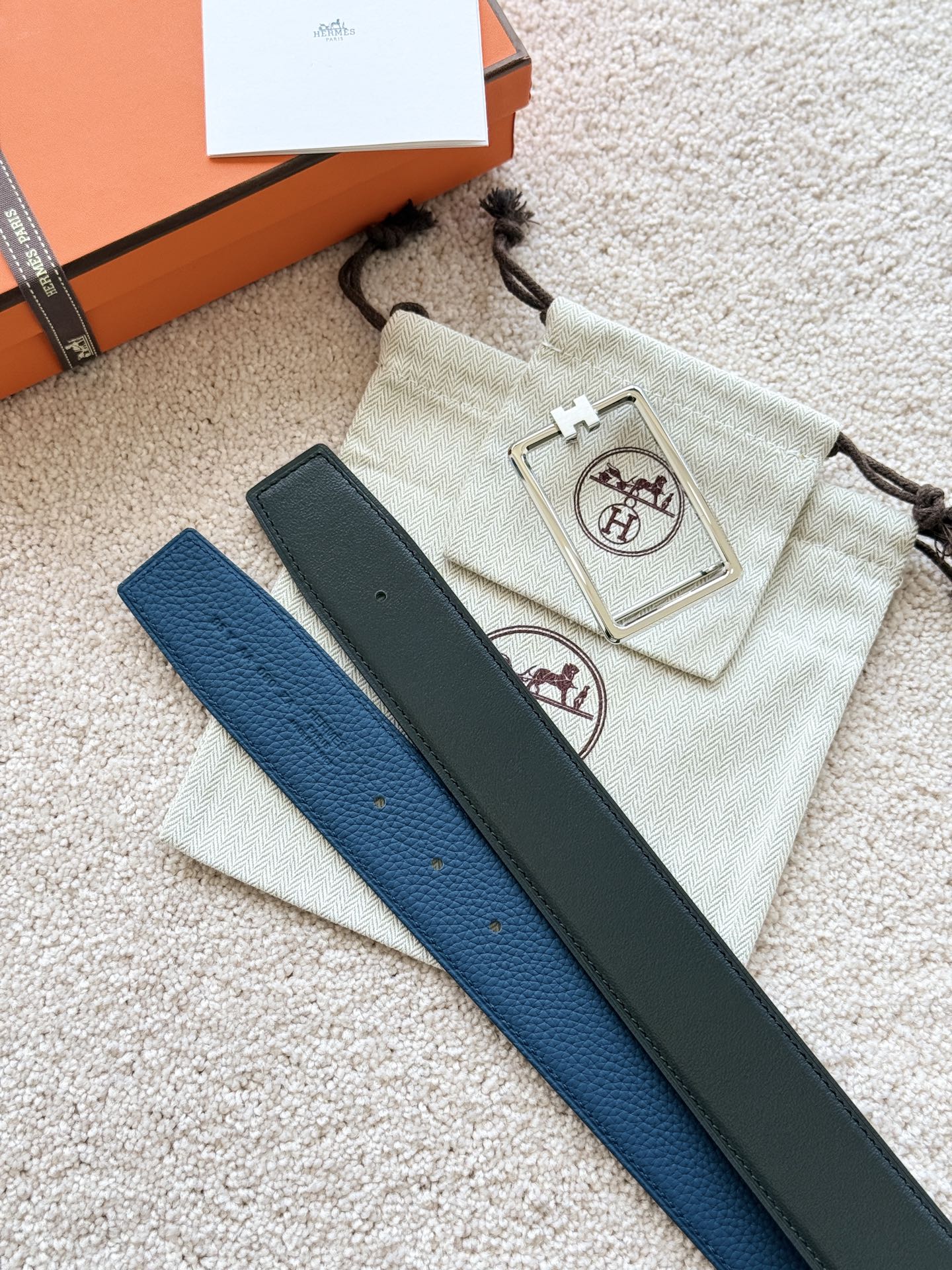 HM Silver Tube H Buckle Belt 38mm Prussian blue Black Leather 187523