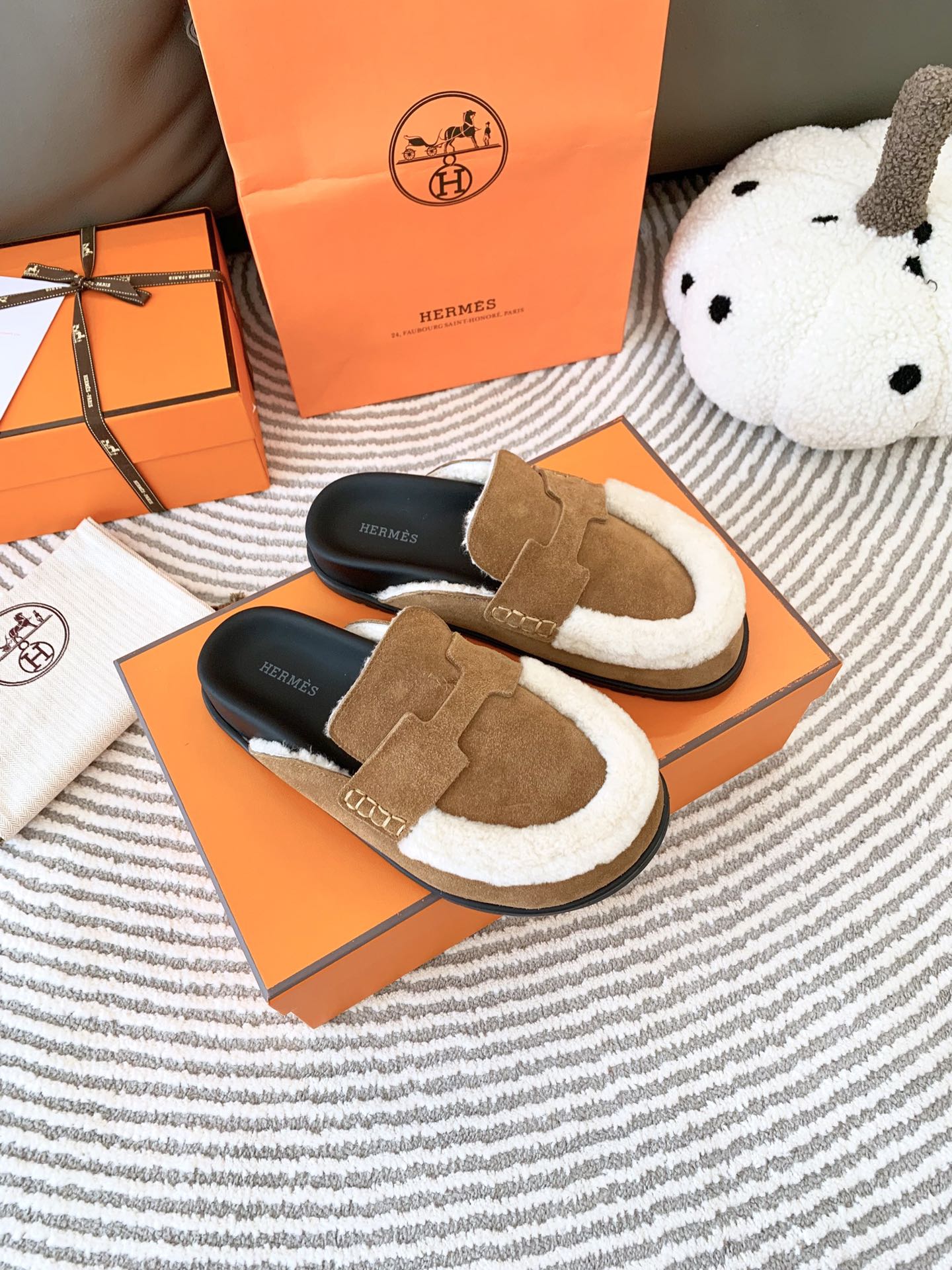 HM Go Mule Brown Mix White Suede Lined With Wool Fleece 963222