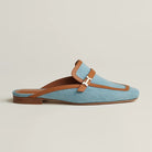 • Material: Mule in H canvas and calfskin with miniature permabrass-plated Paris buckle and contrasting piping.