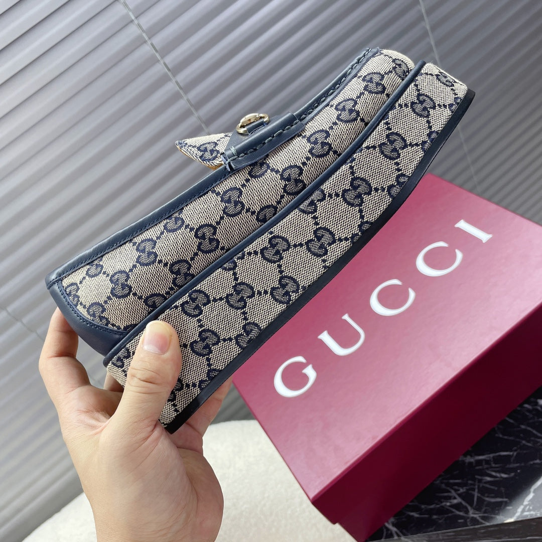 HORSEBIT PLATFORM LOAFER IN TAN BEIGEMONOGRAM JACQUARD FABRIC AND NAVY BLUE CALFSKIN