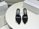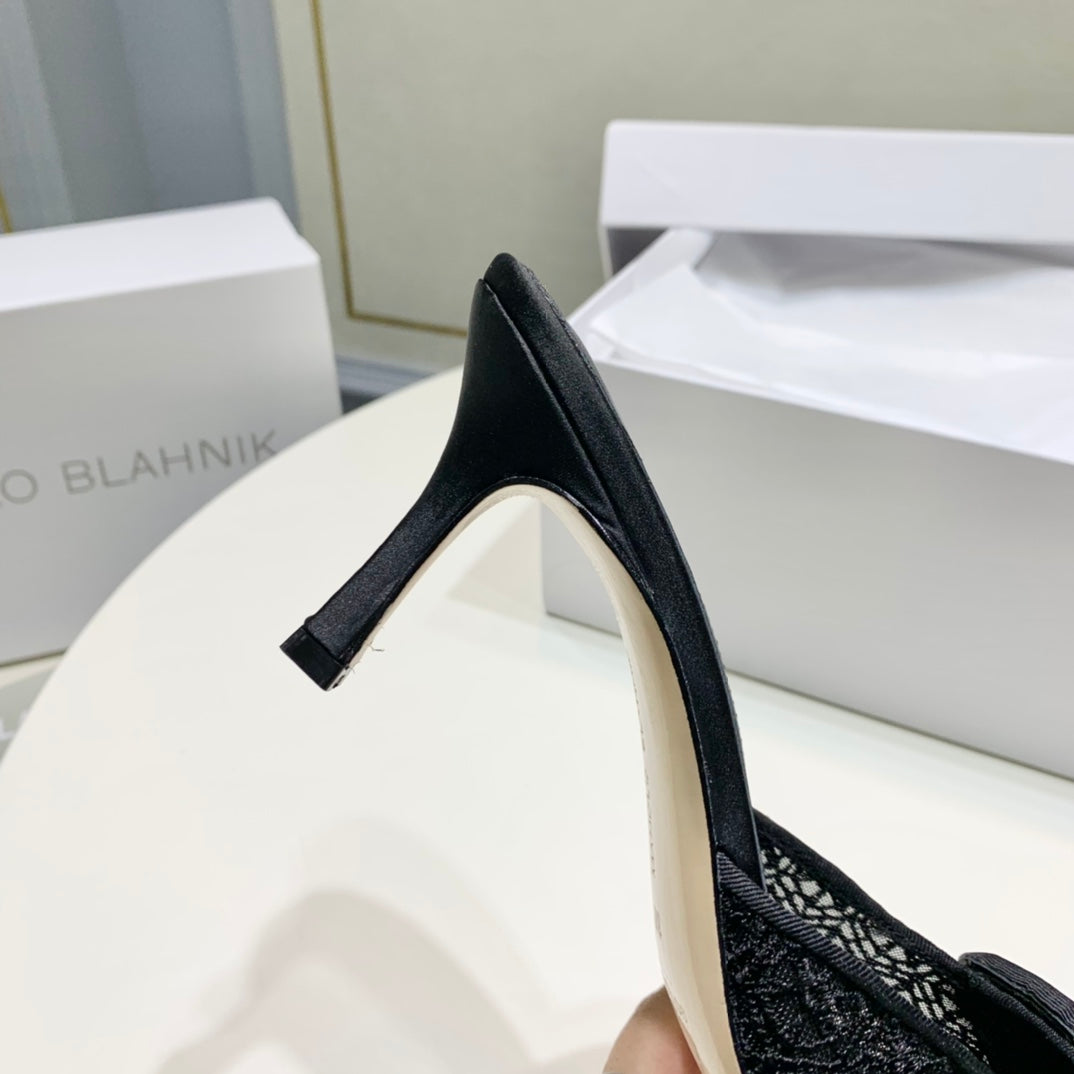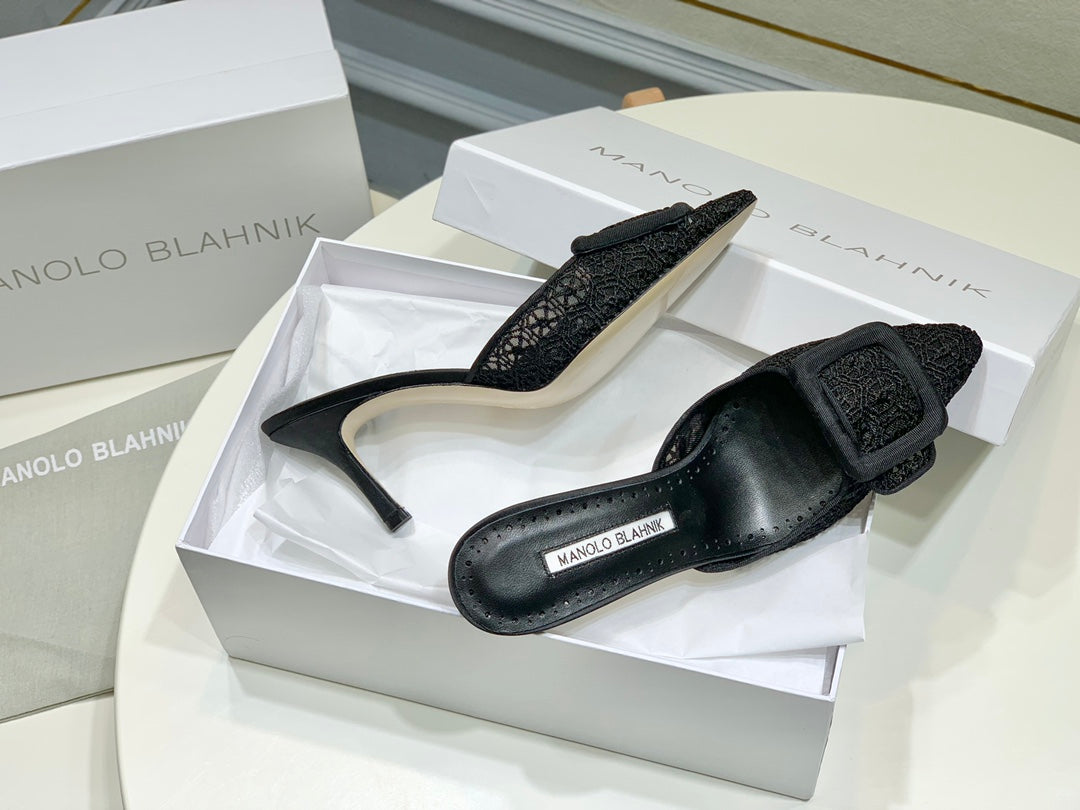Manolo Mules 7cm Black Hollow Lace Leather Bottom 451197