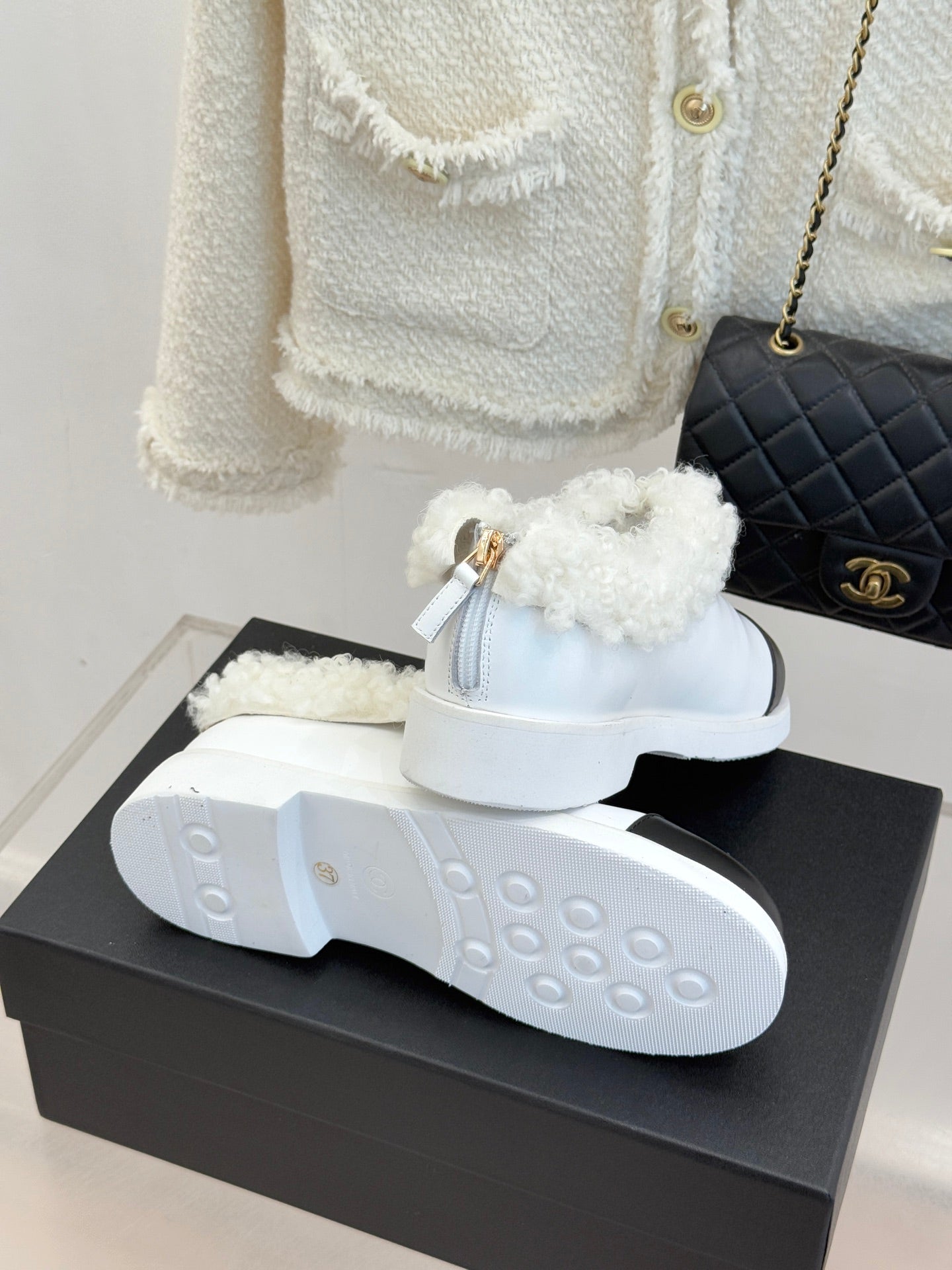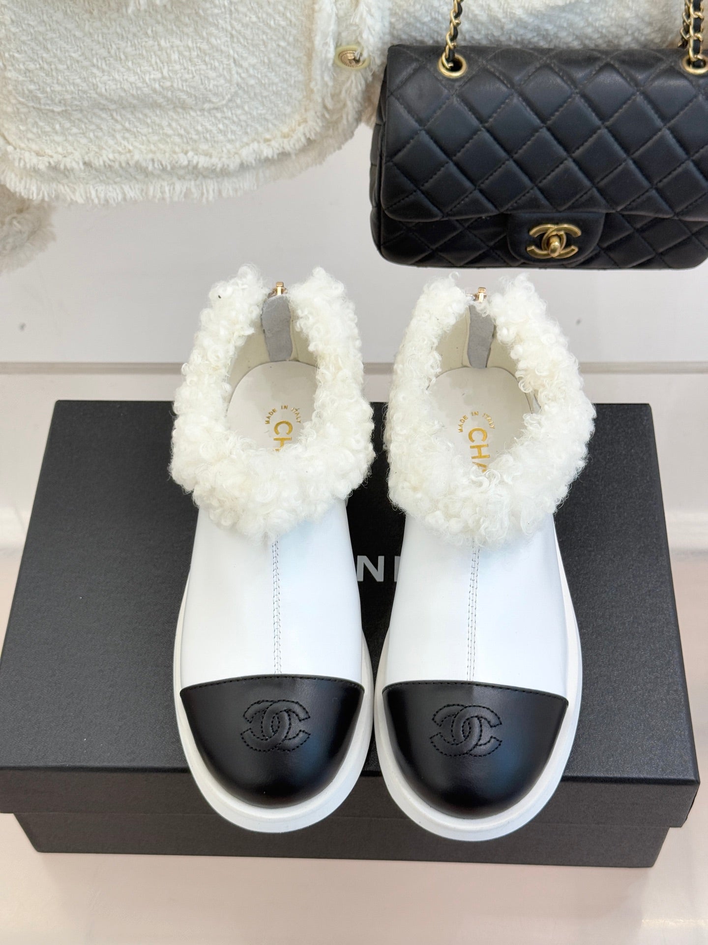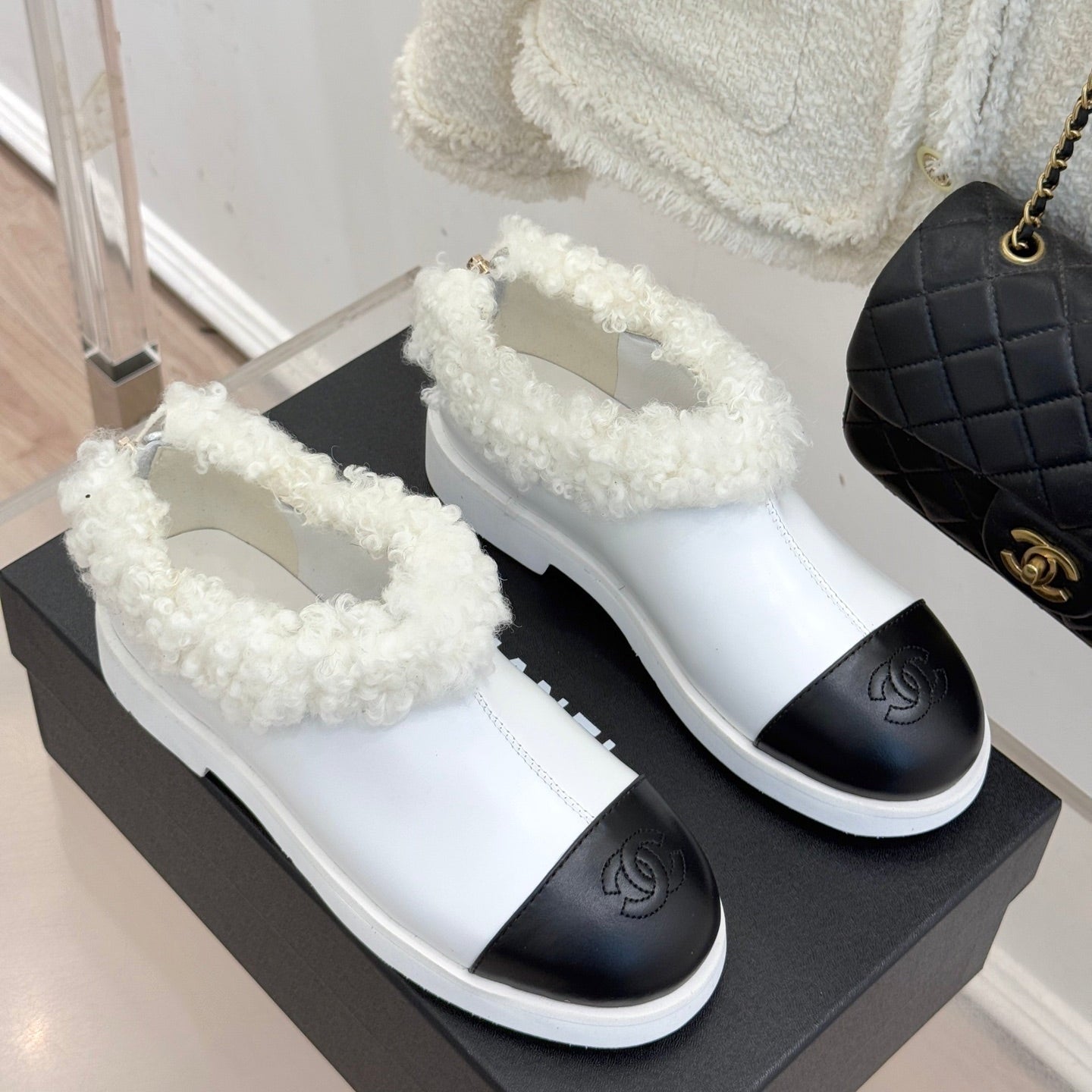 CC 25s Furry Snow Boots White Black Leather Wool 512065