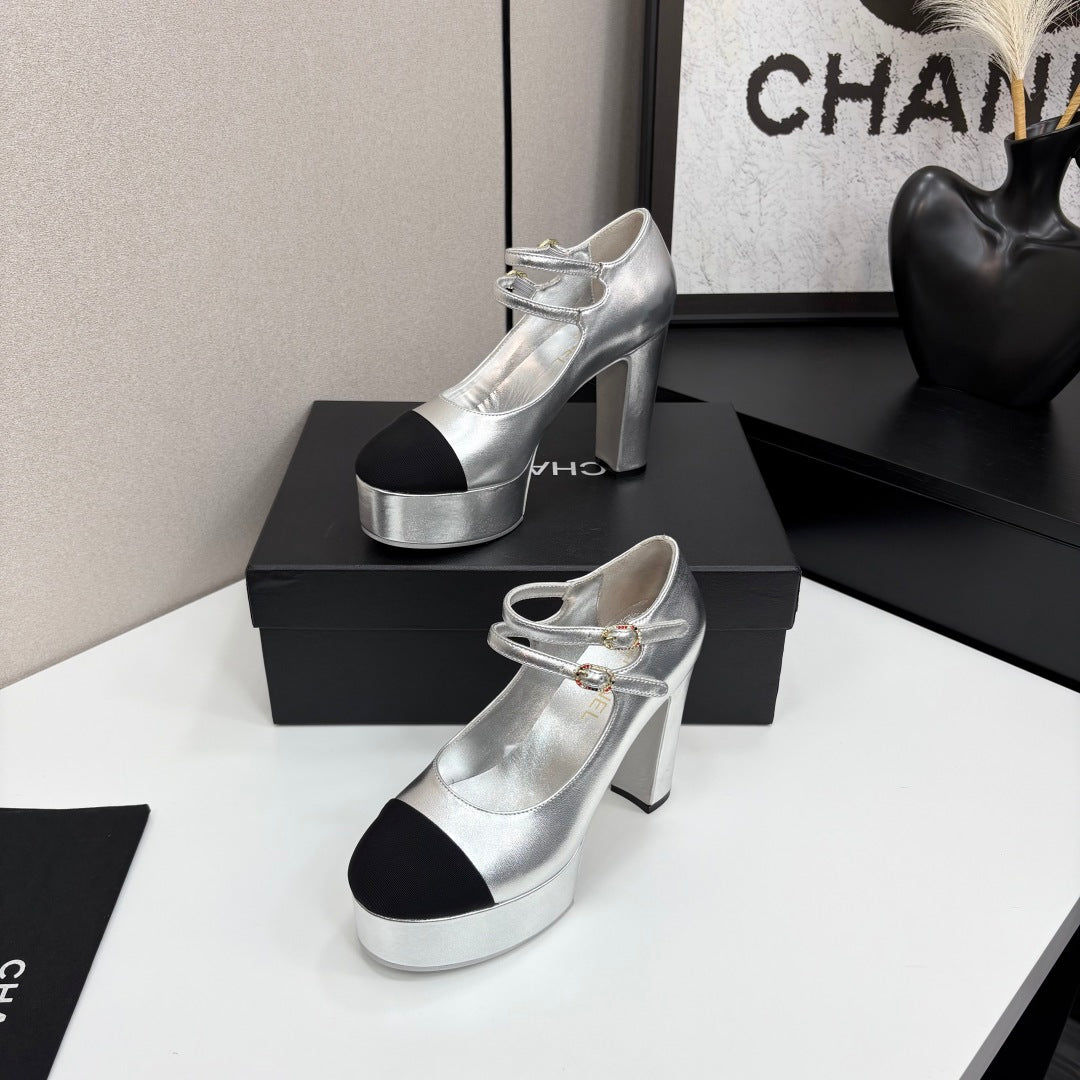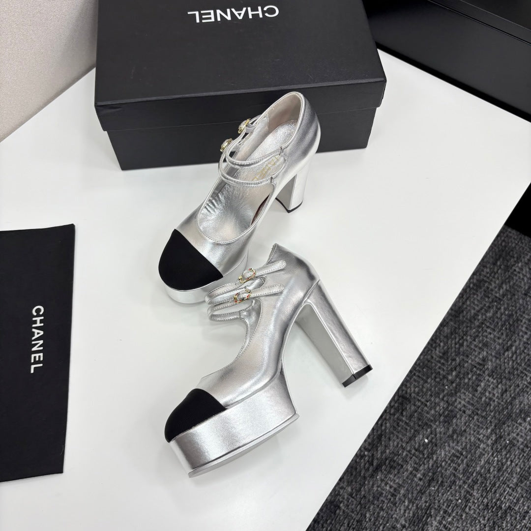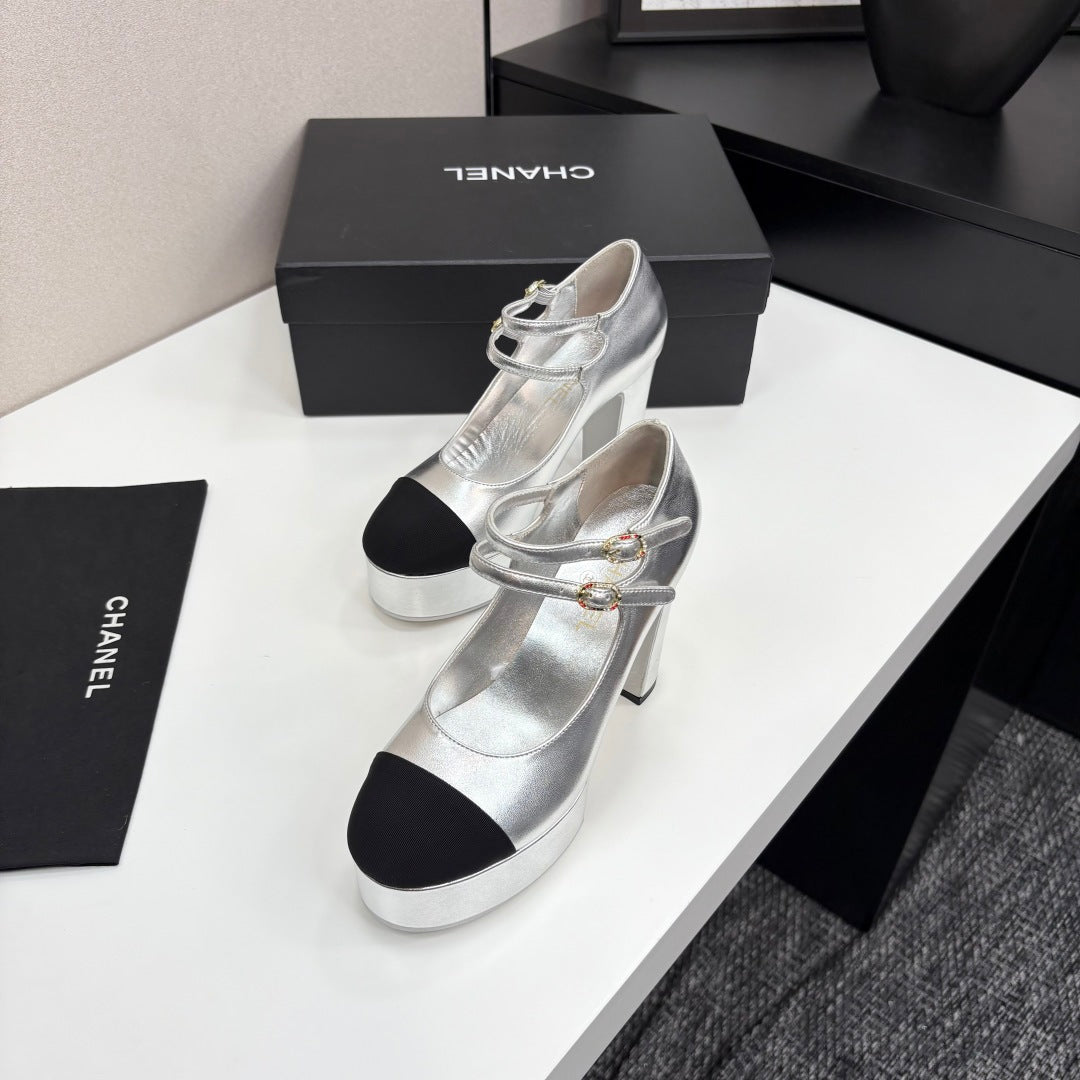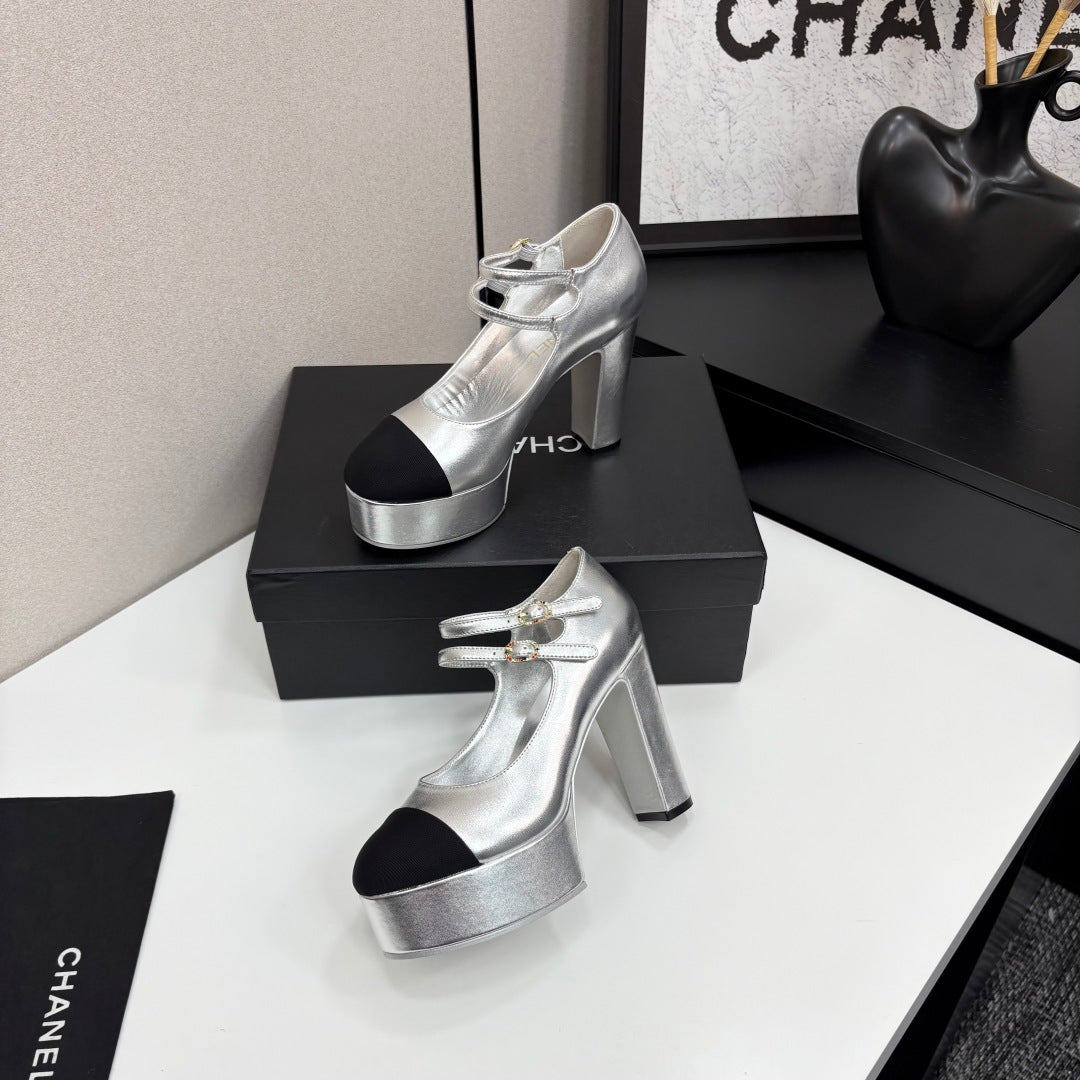 CC 25S Mary Jane Platform 11cm Silver Metalic Calfskin Grosgrain