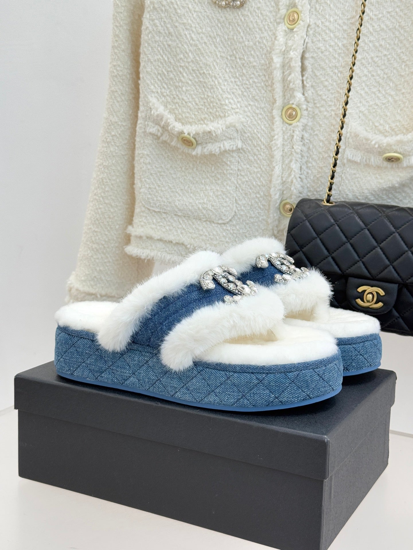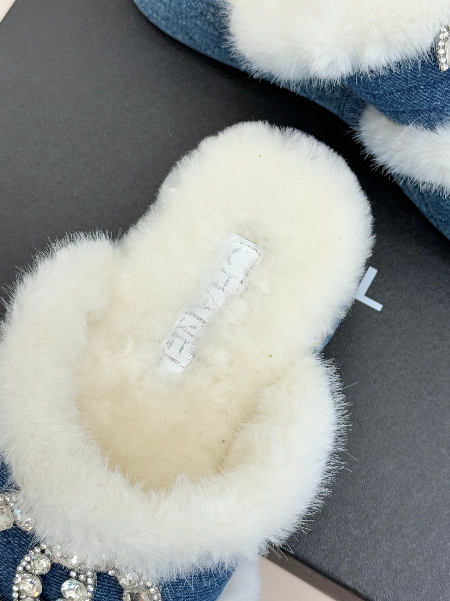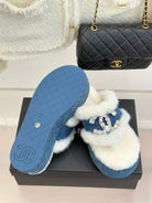 CC slipper double C rhinestone buckle white blue wool 512053