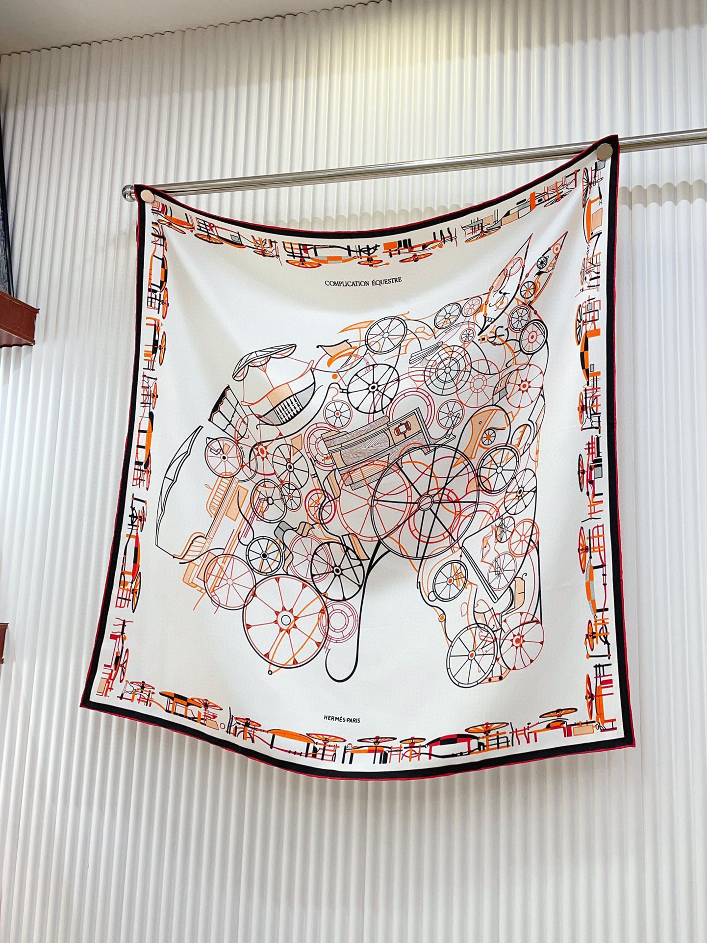 Complication Equestre Scarf 90 CM In White Orange Coloful Silk Twill 345897