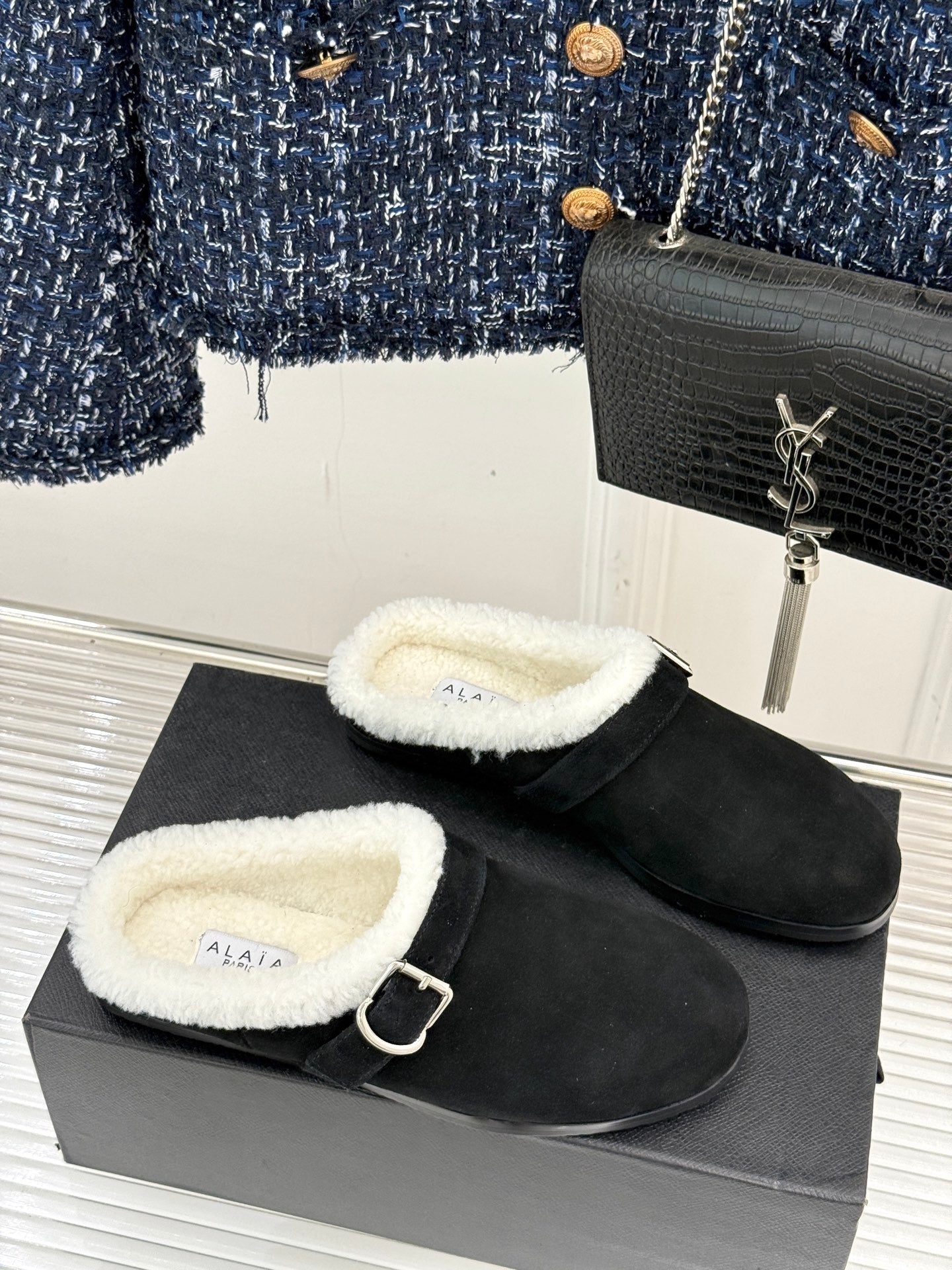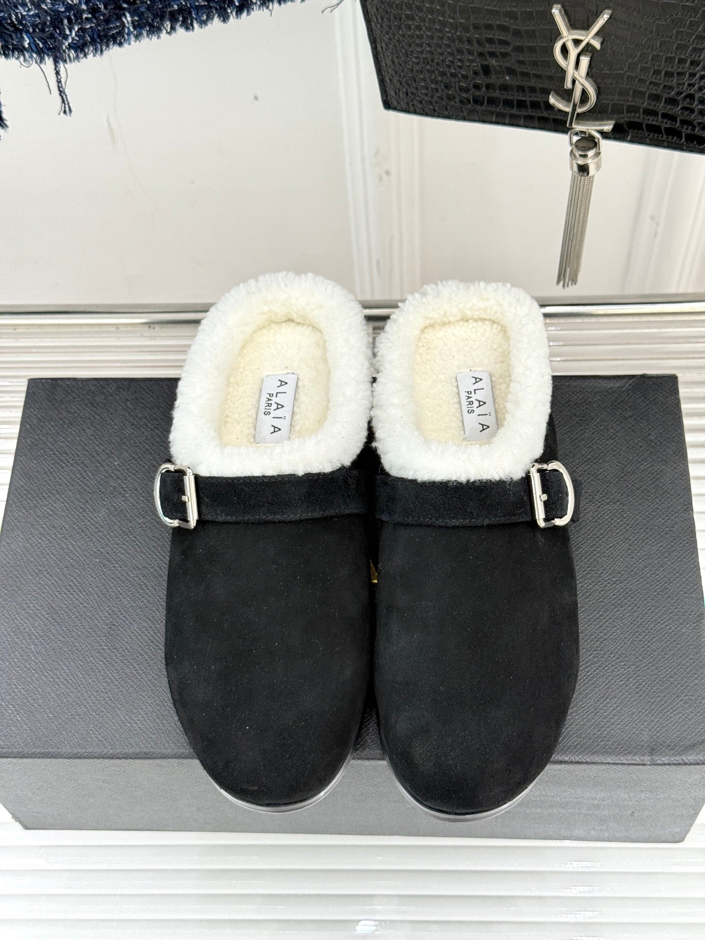 Alaia 25WF slippers belt buckle black suede wool 472226