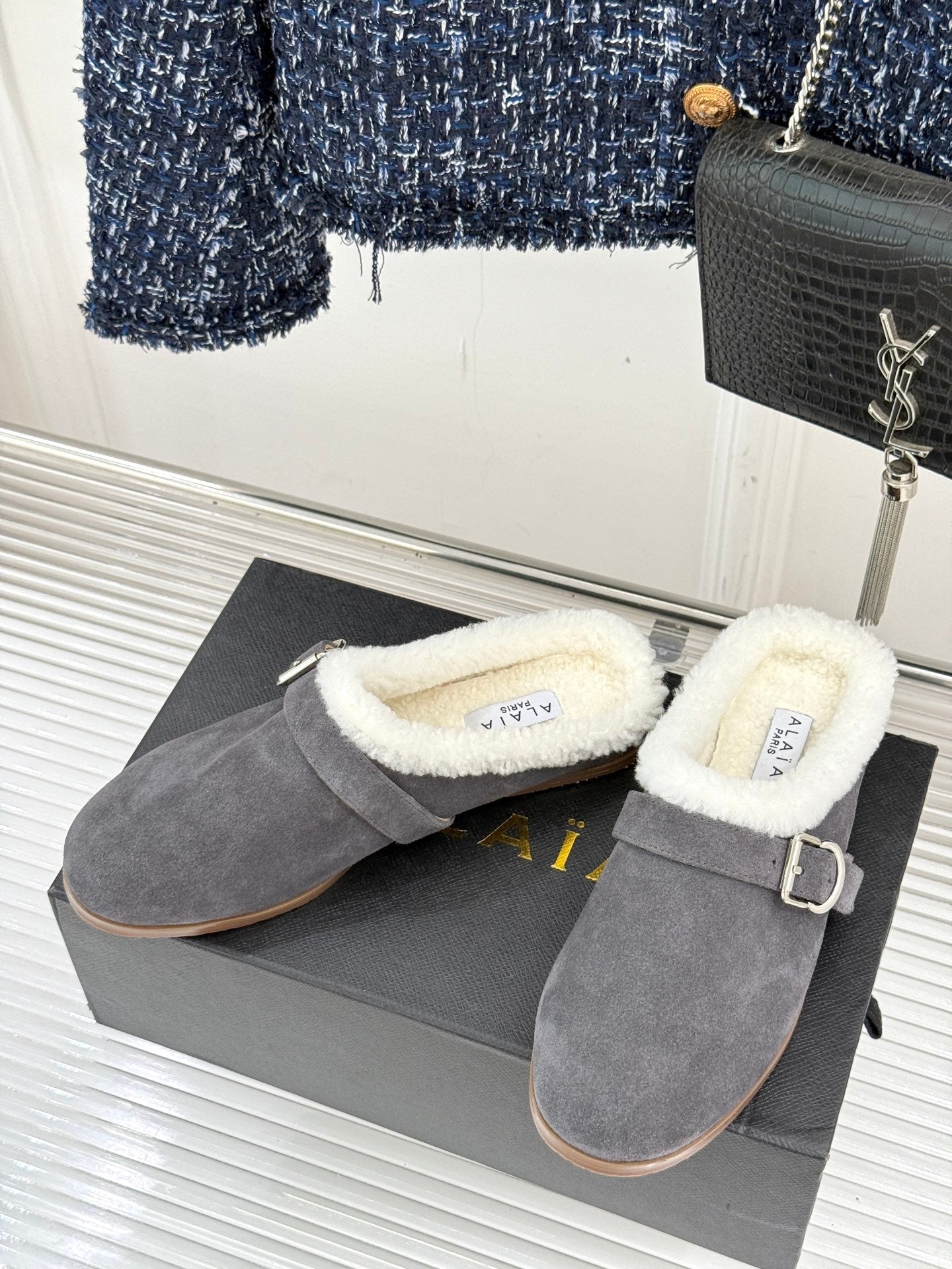Alaia 25WF slippers belt buckle charcoal grey suede wool 472230