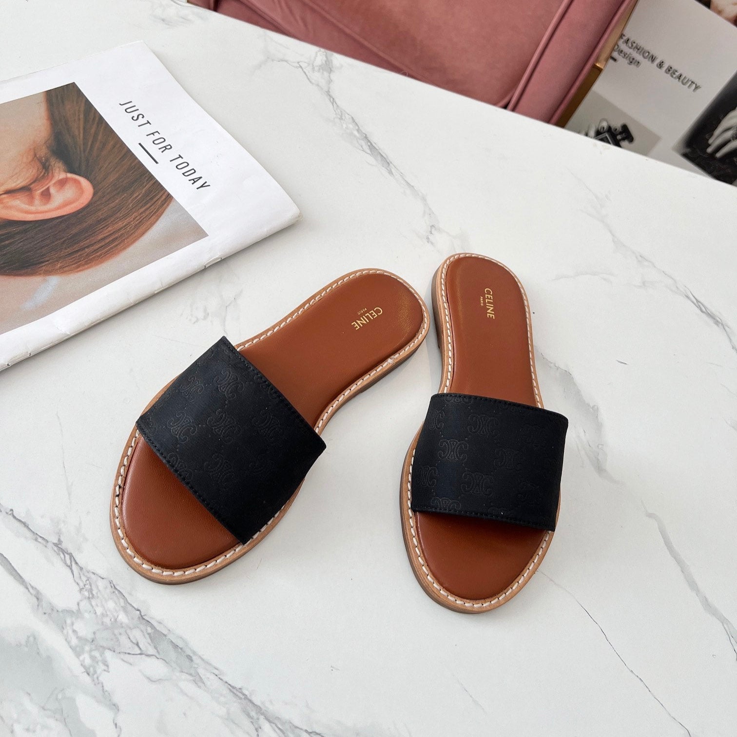 Celine 25C Slippers Black Monagram Silk with Calfskin 238147