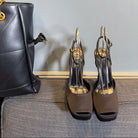 LA SCANDALE PLATFORM SANDALS IN TAUPE BROWN SATIN