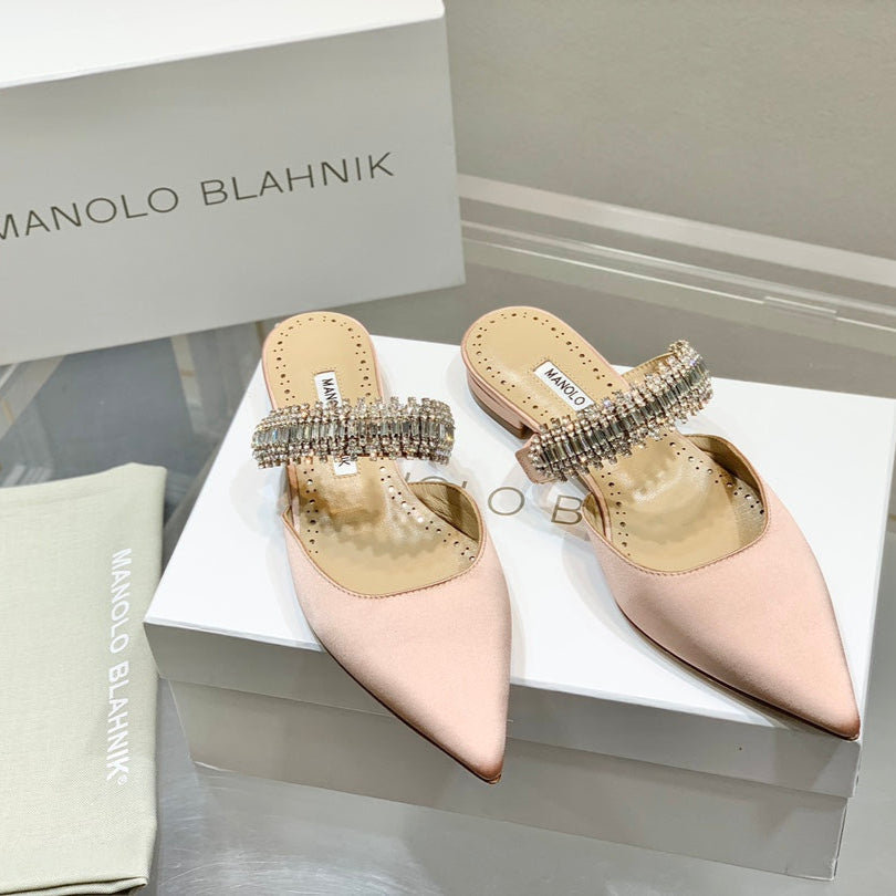 Manolo Flats Mules Diamond Buckle Pink Nude Silk Satin 327488