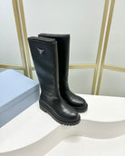 KNEE BOOTS WITH TRIANGLE LOGO IN BLACK CALFSKIN