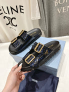 PRA CROCODILE MOTIF STRAP SLIDES SANDALS BLACK AND LAPIS CALFSKIN