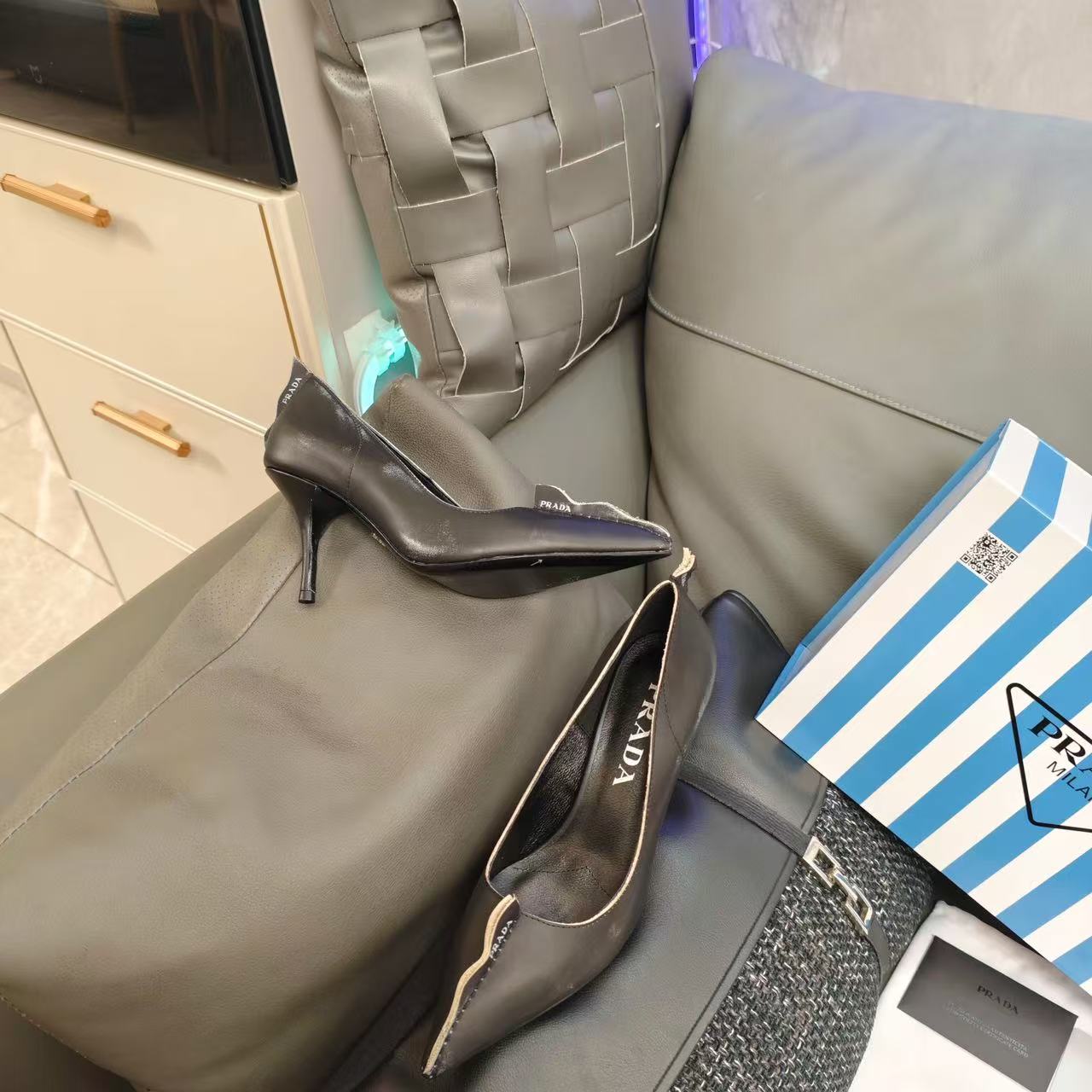 Prada Antiqued Pumps Black Tan calfskin