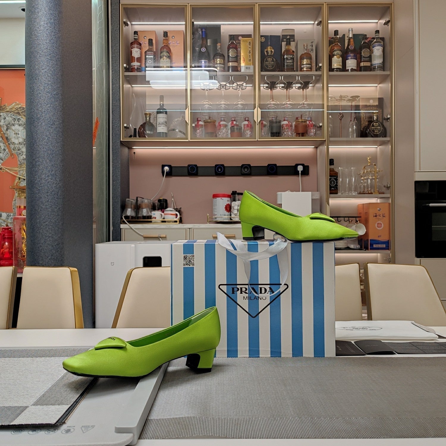 TRIANGLE LOGO PUMPS IN APPLE GREEN SATIN