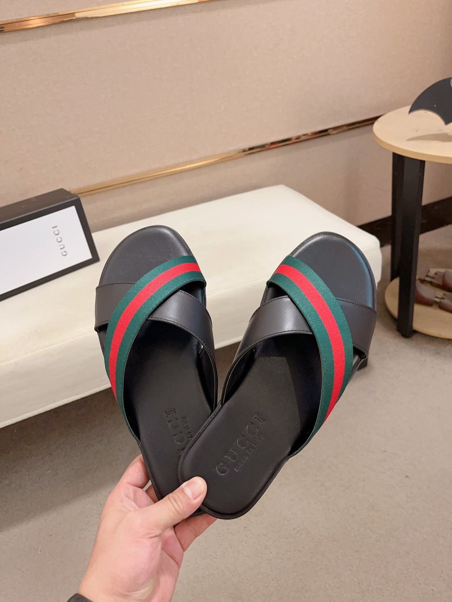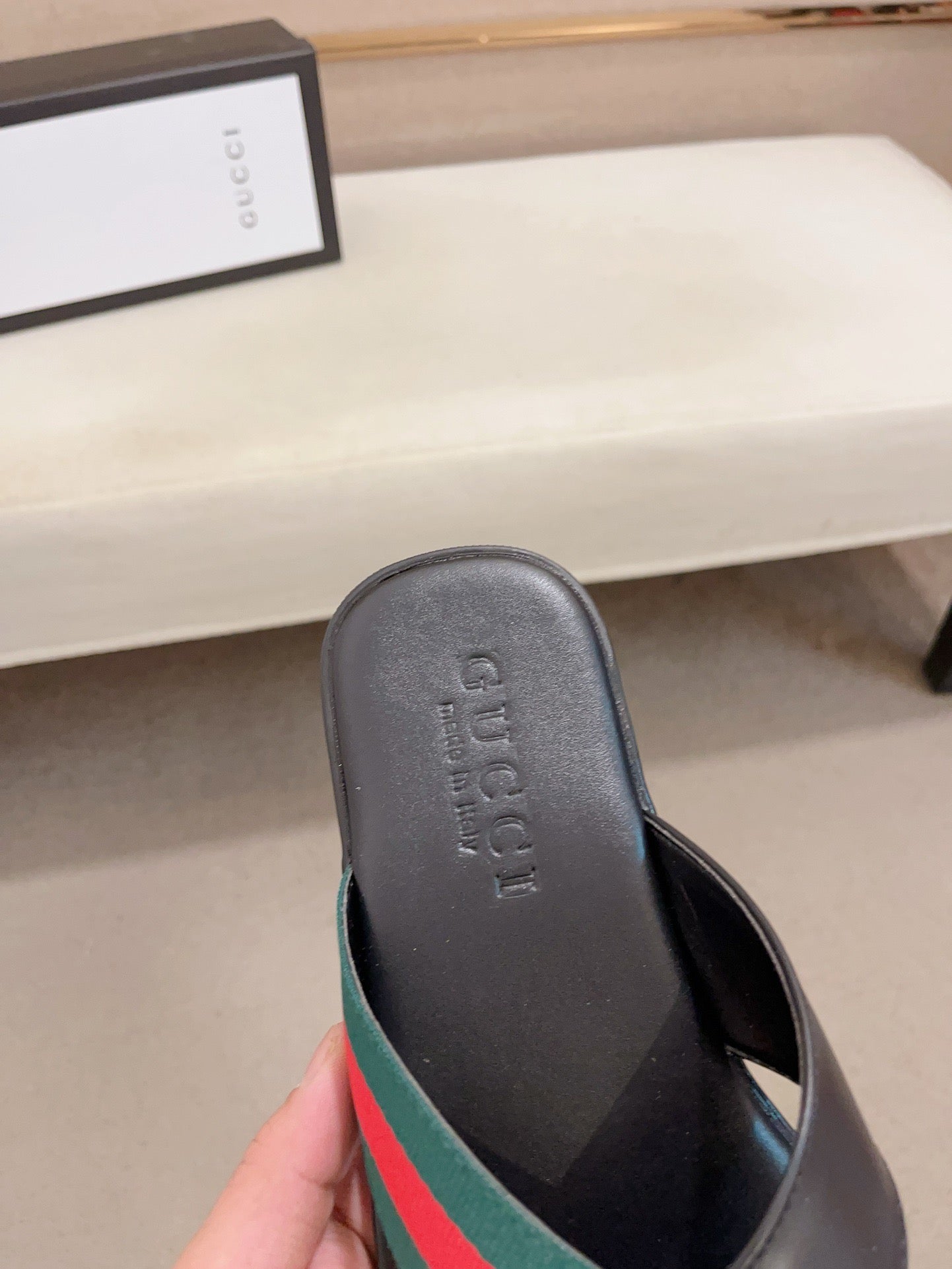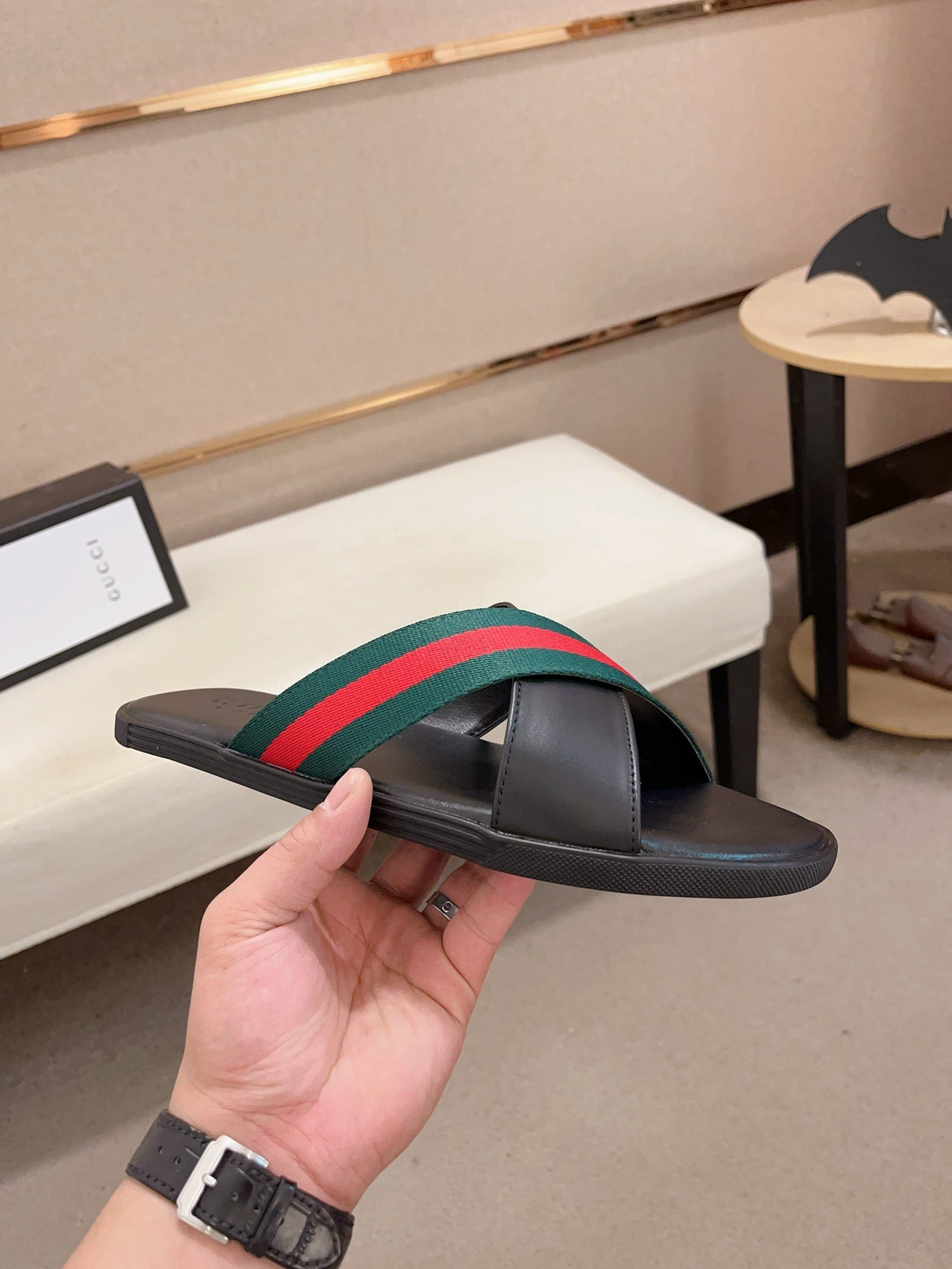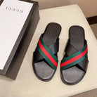 GG Men's Web Slide Black Green Cowhide 554606