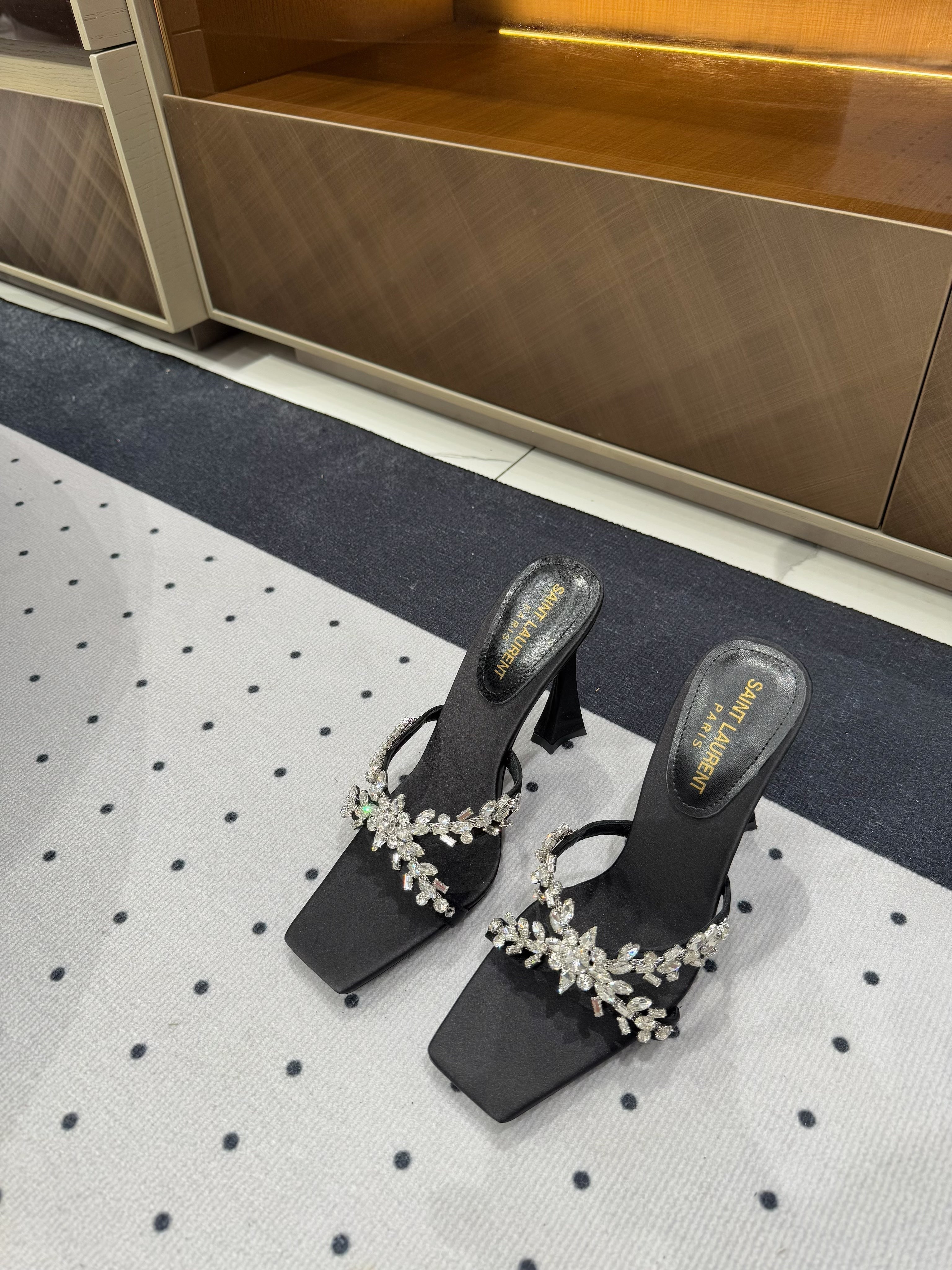 HIGH RHINESTONE CROSS STRAP MULES IN BLACK SILK