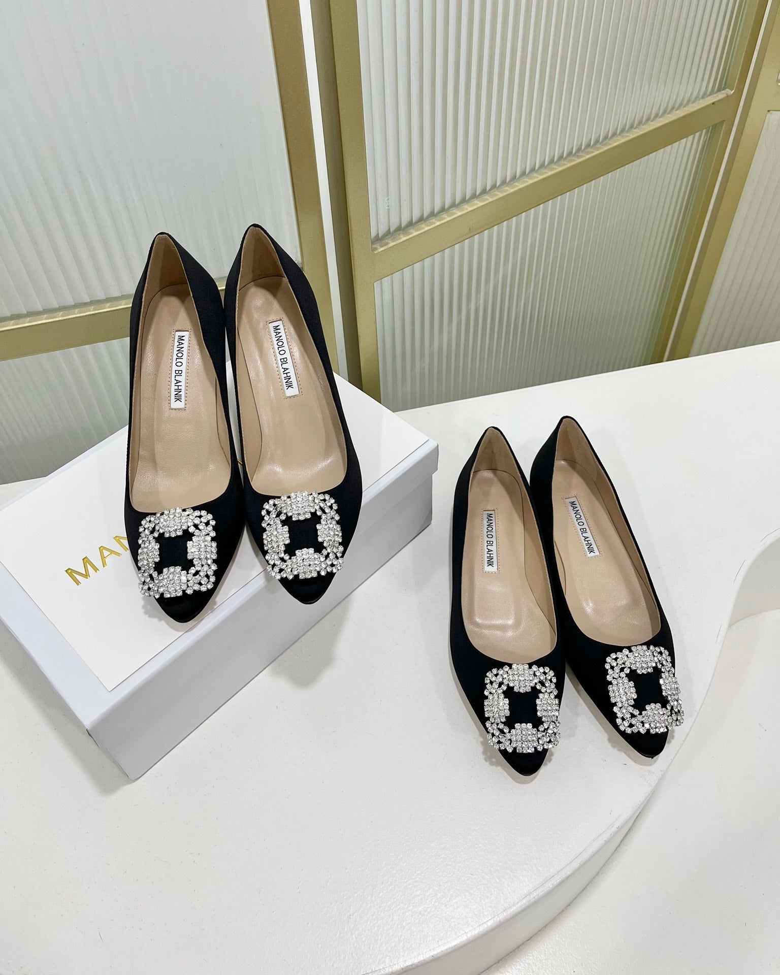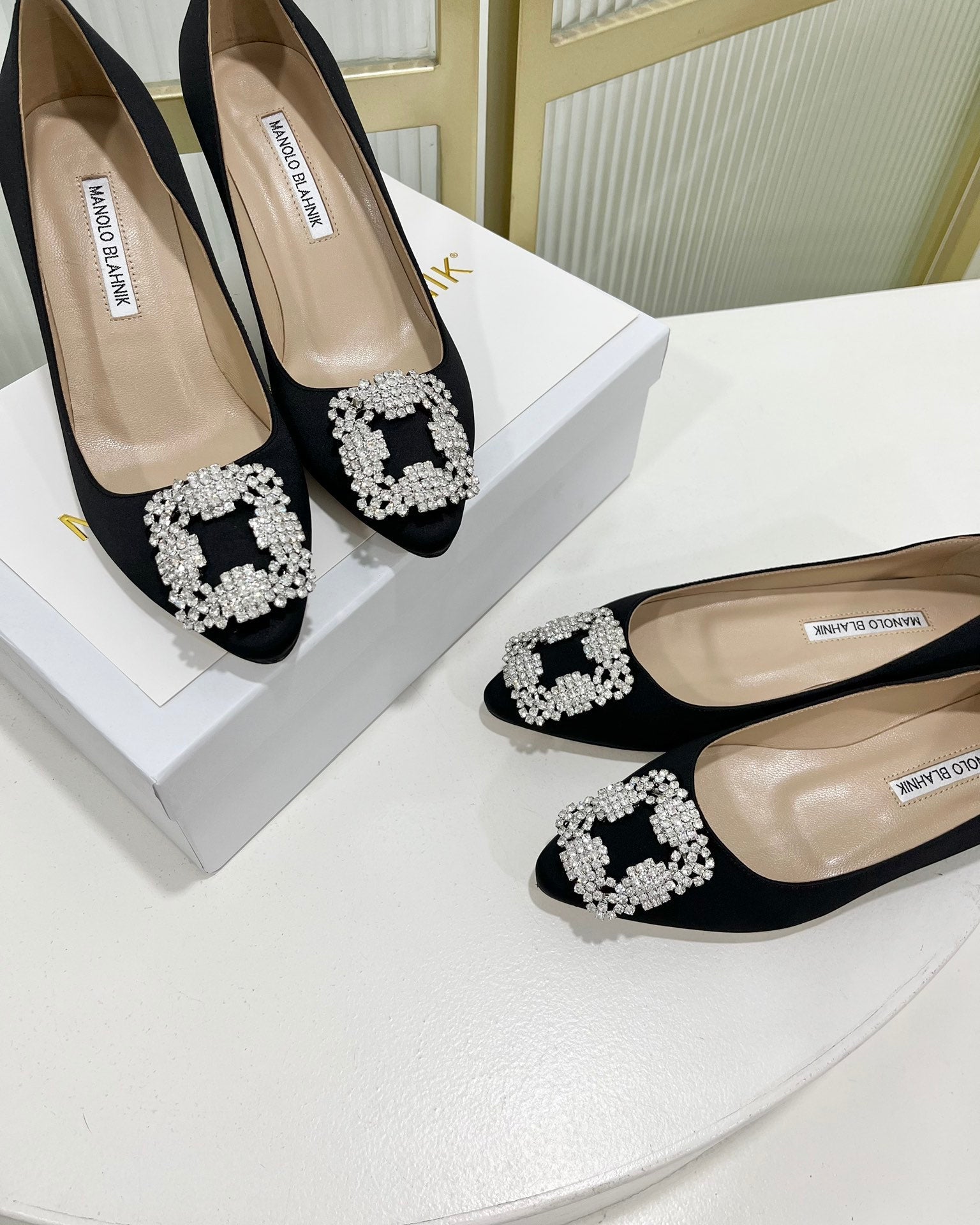 Manolo Hangisi Black Satin Jewel Buckle Pump 95